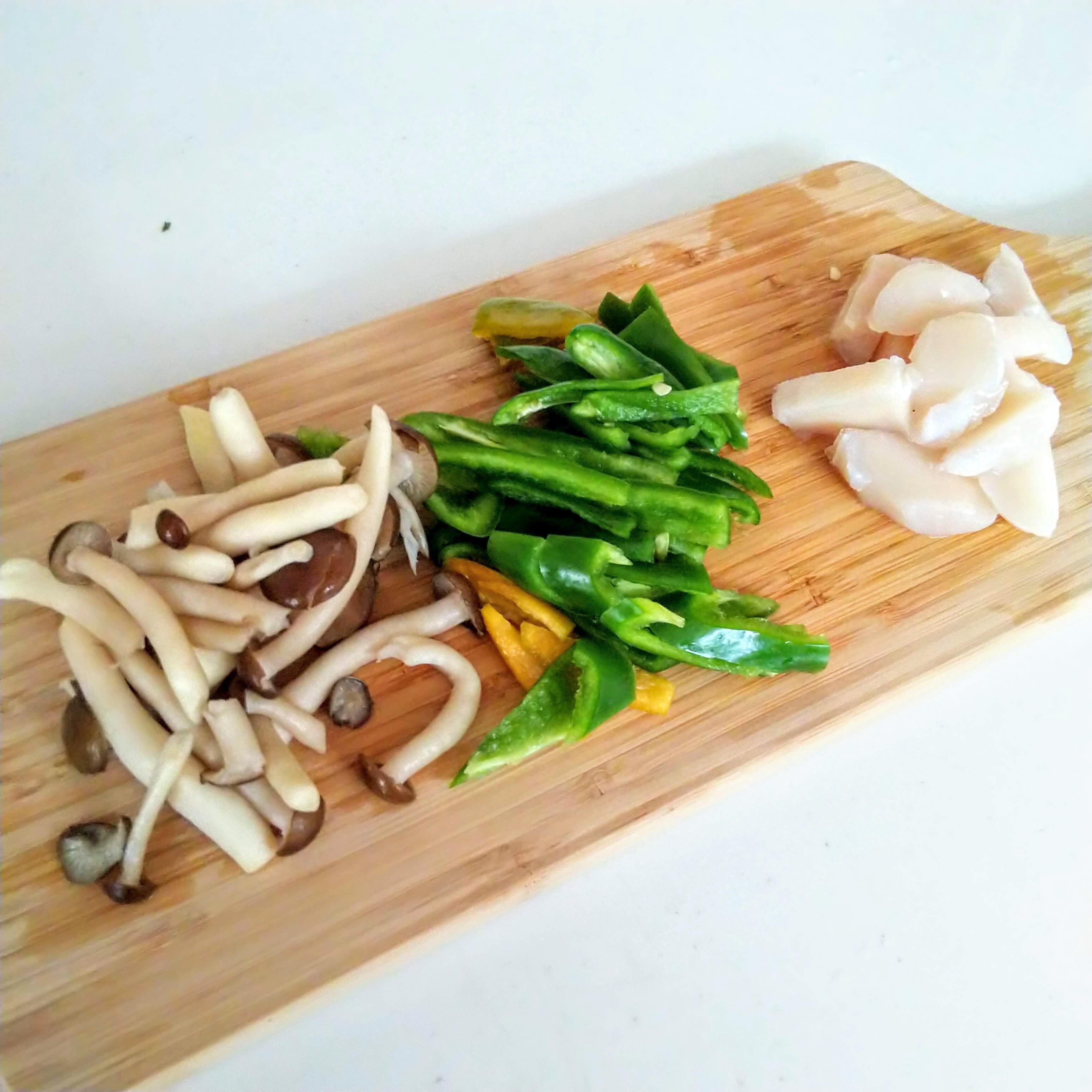 味が濃いめだったので、一工夫で冷蔵庫にある食材を混ぜてみました。しめじ、緑・黄パプリカ、ホタテです。