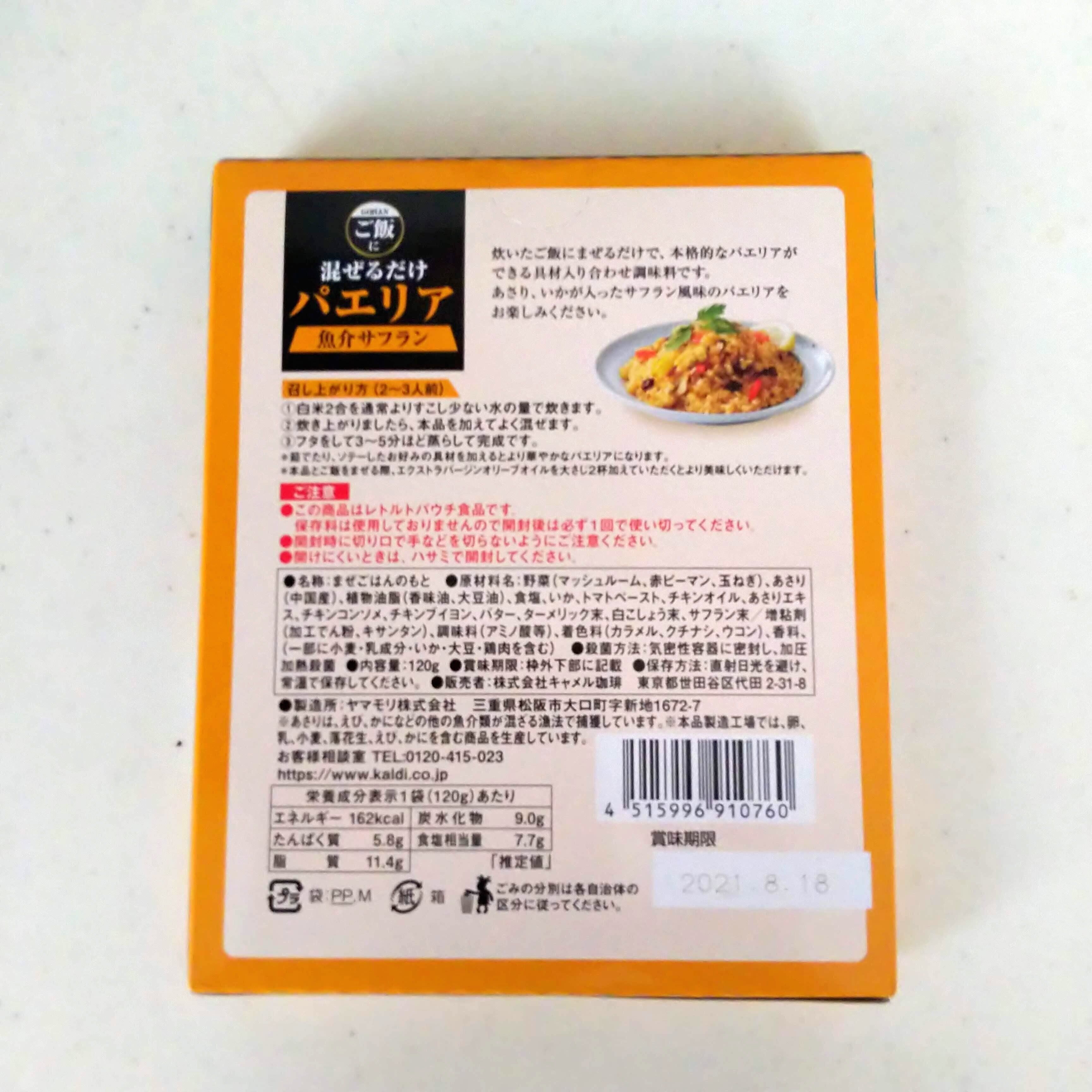 カルディ 混ぜるだけパエリア 魚介サフラン(2〜3人前)298円(税込)です。