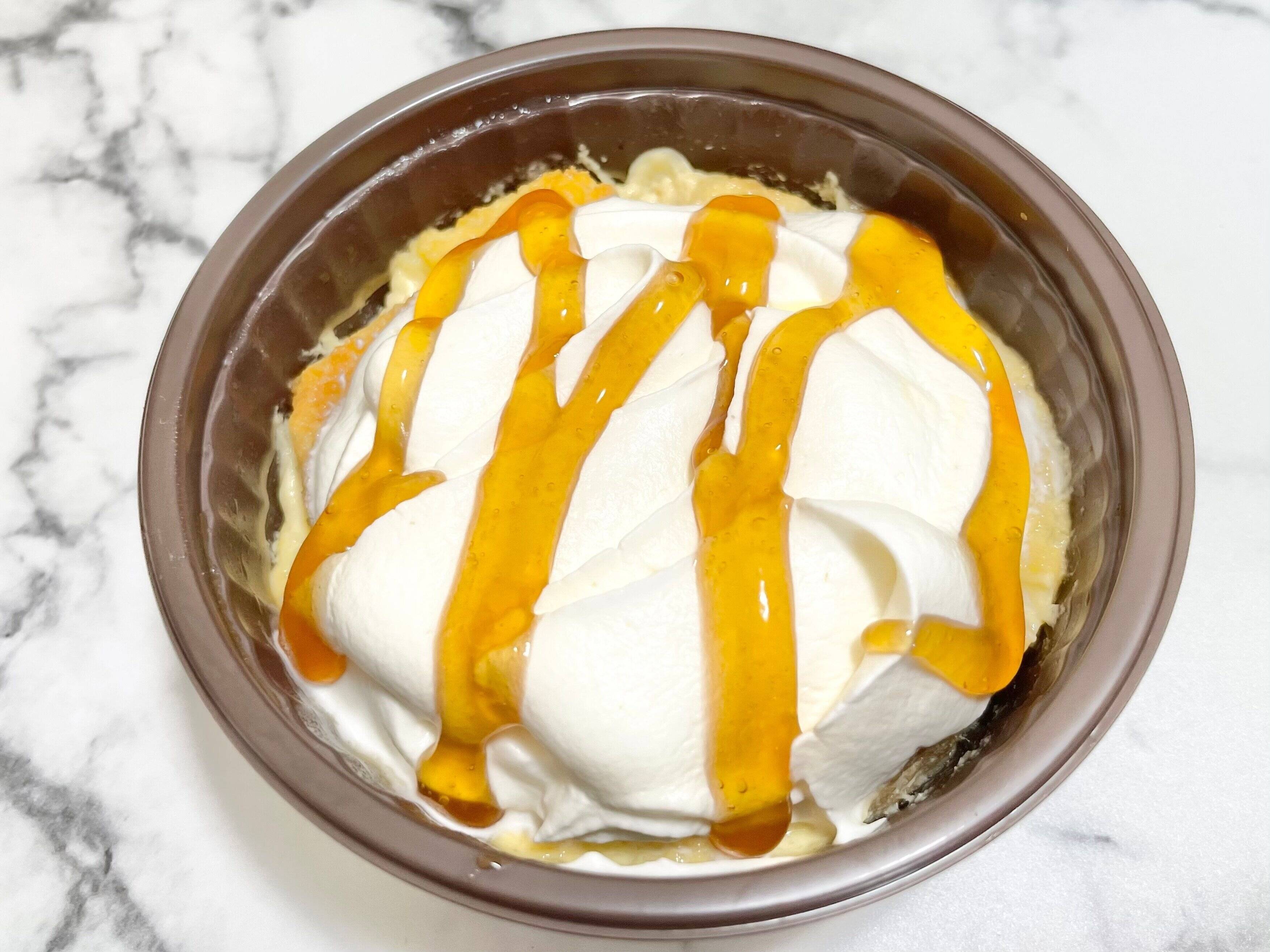ふたを開けると、ふわっとしたホイップにメープル風ソースがかかっていて食欲をそそります。