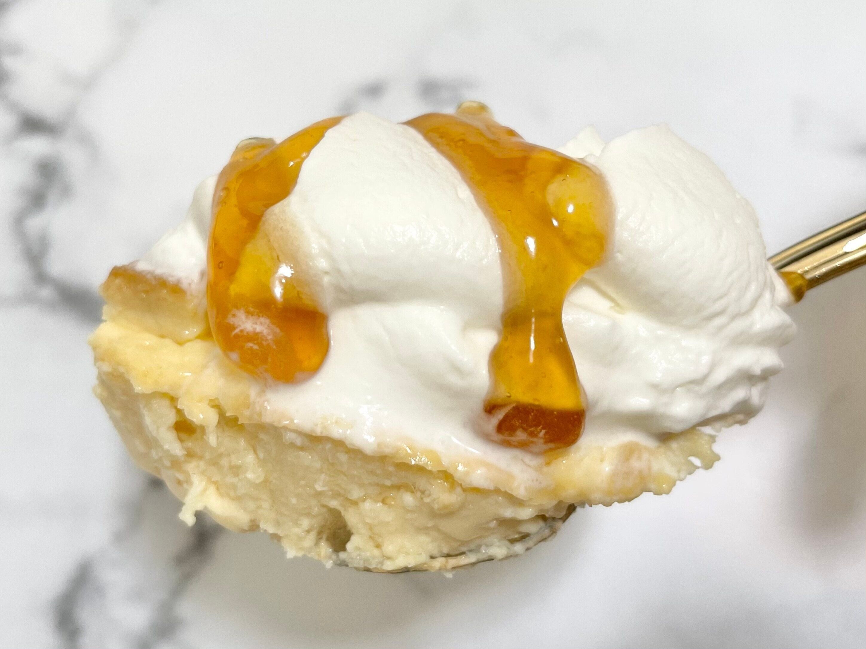 プリン液が染み込んだ角切り食パンの上に、カスタードソース、ホイップクリーム、メープル風ソースが順にのったスイーツです。