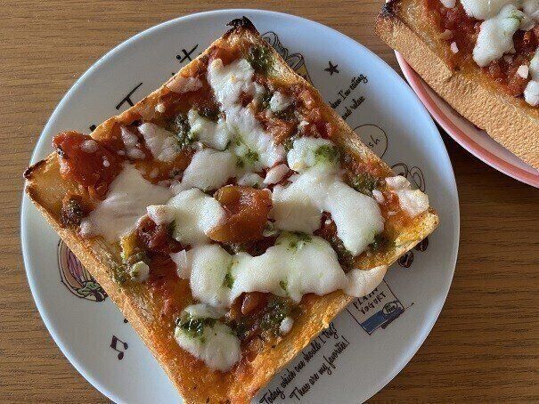 チーズをのせてバジルソースを少しかけてトースターで焼くだけで絶品マルゲリータ風トーストの完成。