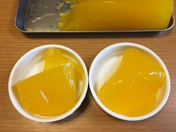 1Lの大容量ゼリー、まずはパックから出してそのまま味わいます。爽やかな甘みと酸味でとっても美味しいオレンジゼリー!
