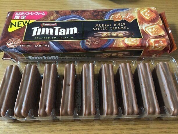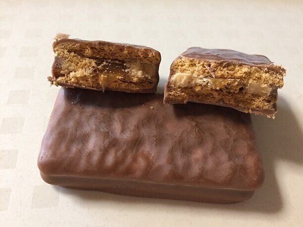 甘さの中にほんのり効いた塩気が絶妙!チョココーティングにキャラメルクリーム、全体的には甘いけど、中央のキャラメルソースの塩気が全体を引き締めて飽きのこない美味しさ。とろ~りクリームとサクサクのビスケットの食感も楽しいお菓子です。