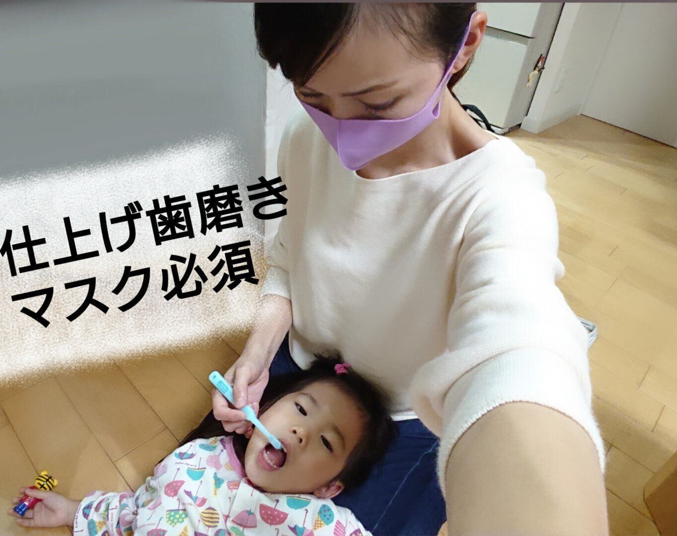 マスクは常に必須ですが、やはり気が緩んではずしてしまうことはありますよね。それでも、こどもの仕上げ歯磨きをする時は絶対にマスクをつけています。この時ほどダイレクトに唾液を浴びる場面は、なかなかないですから!(笑)
