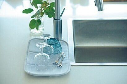 表面はソフトなポリエステル素材で、繊細な食器の水きりも安心。裏面は吸水性がよく、乾きやすいメッシュ。