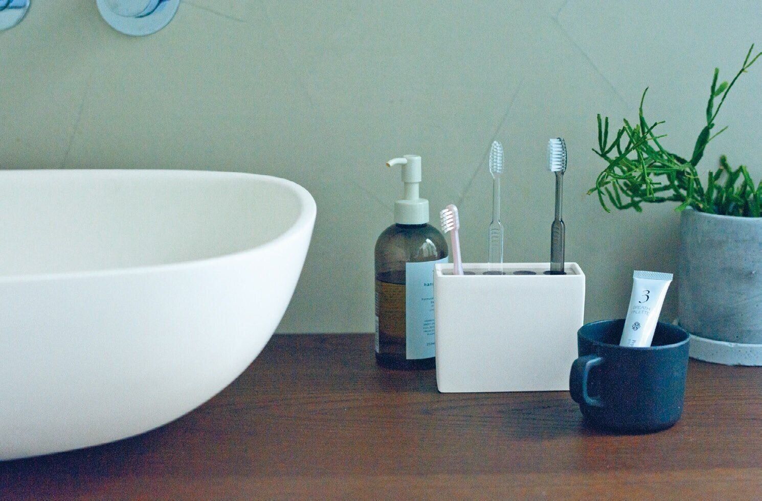 使い終わったあと、水滴を吸い取ってくれる珪藻土素材。ミニマムなルックスで洗面所になじみ、4本まで歯ブラシを立てられる。