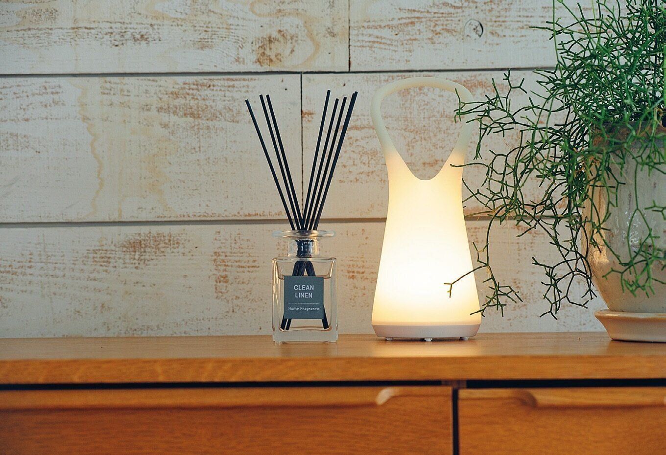 テーブルランプとしても使える電池式ランタン。明るめ→通常→常夜灯の3段階で明るさ調整が可能。アウトドアでも使える防沫(ぼうまつ)仕様。
