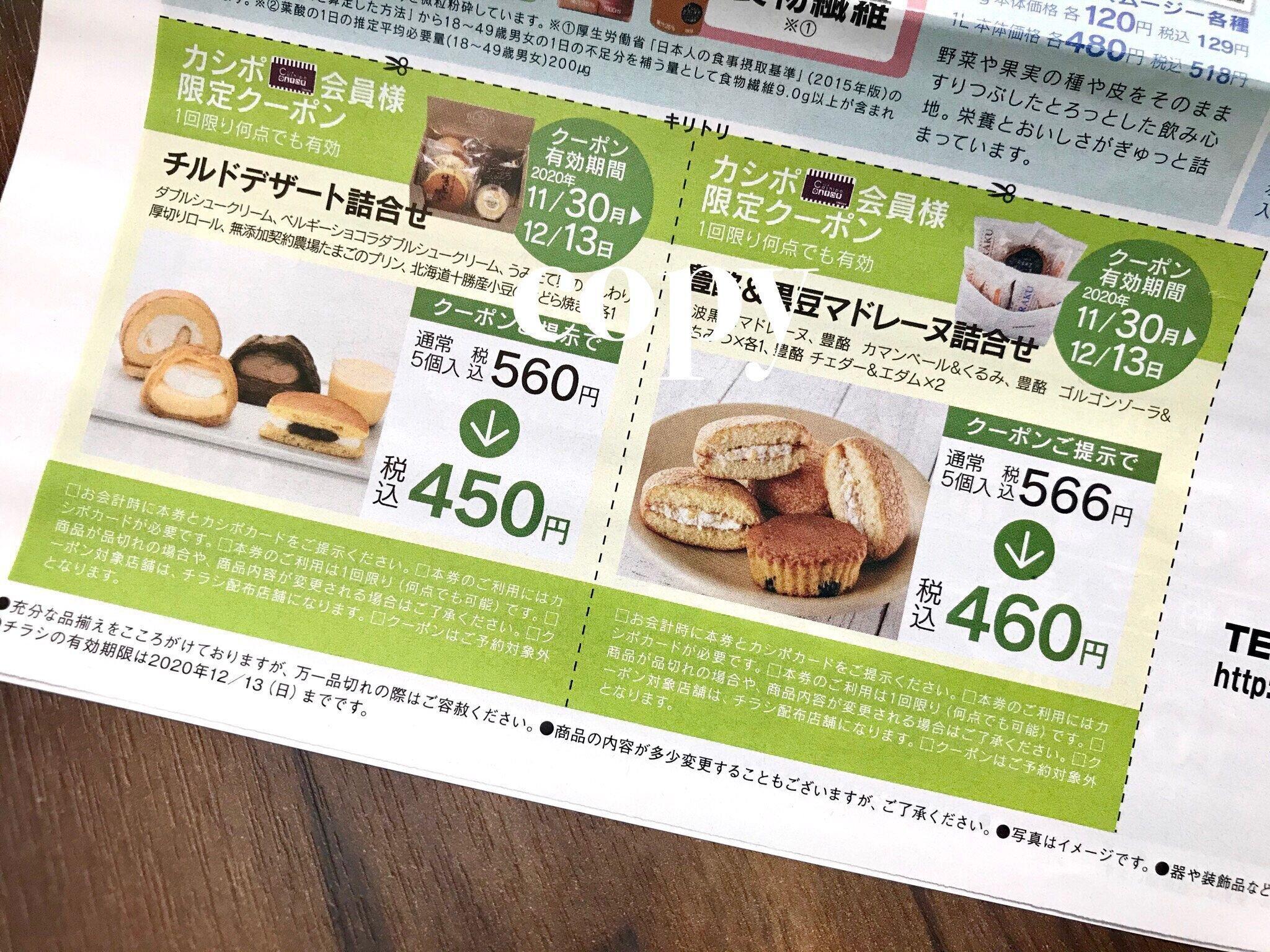 店舗でお買い物をすると新商品やキャンペーンの情報が載ったチラシがもらえて、そこにカシポ会員限定のクーポンがついています。560円のセットが450円になるなんて、なかなか太っ腹じゃないですか!?