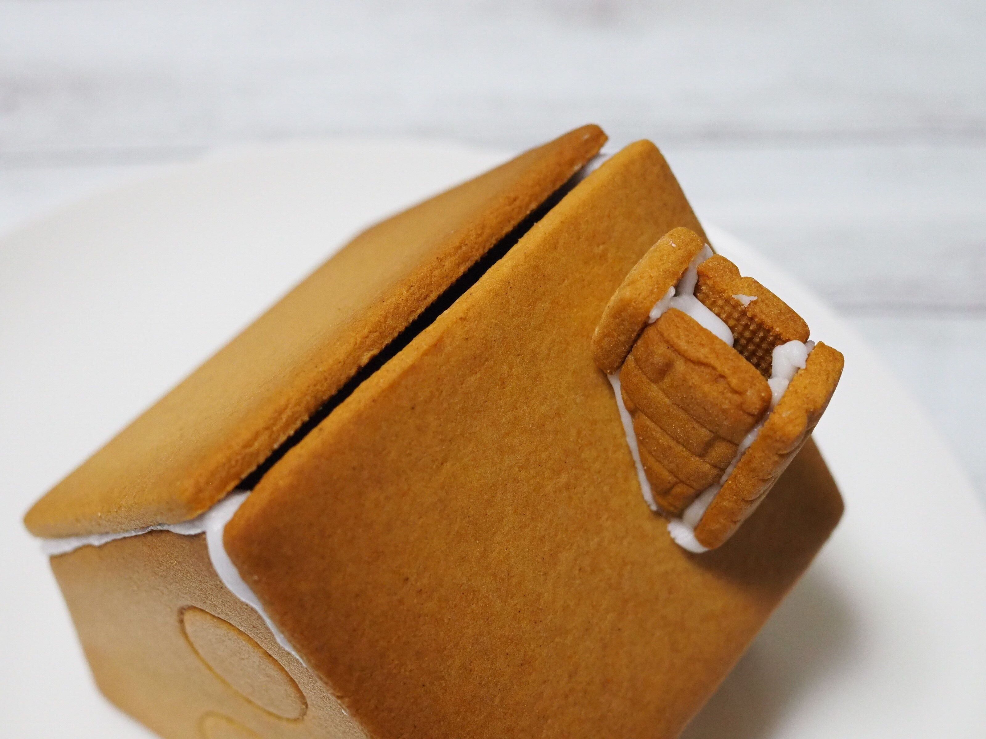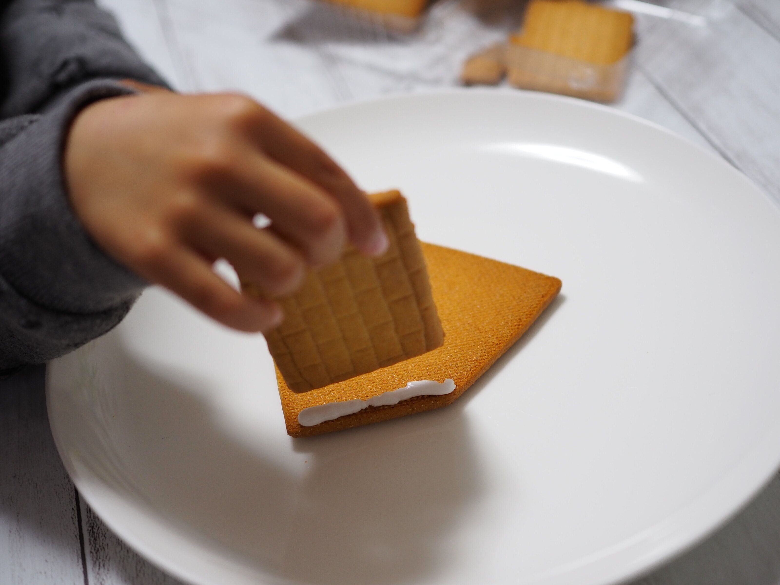 アイシングが完成したら、絞り袋に入れてクッキーのふちに塗ります。そして、このアイシングを「のり」代わりにして、クッキー同士をつけていきます。