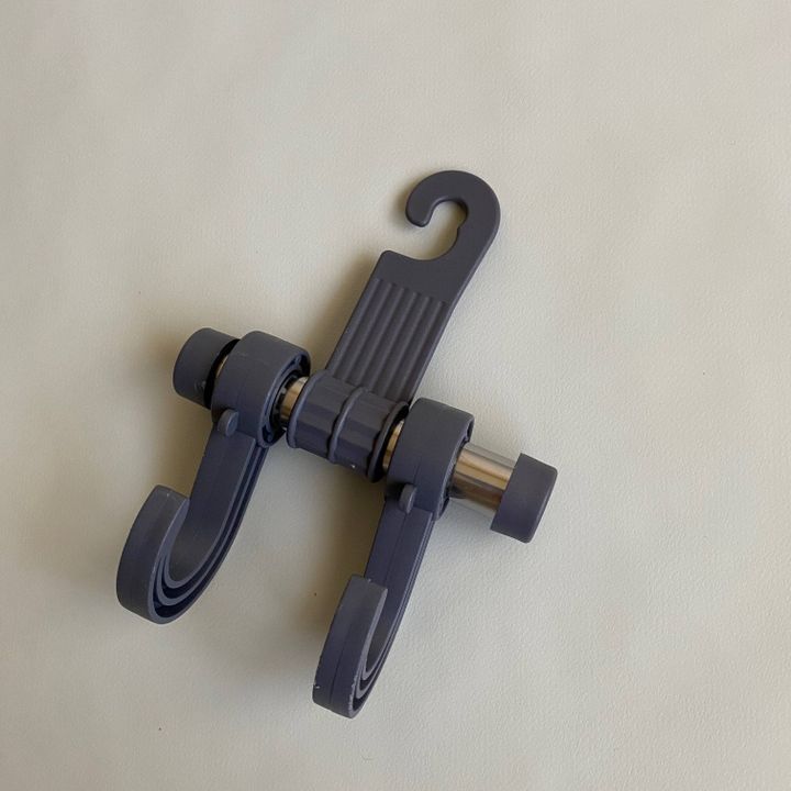 シートフックを車のヘッドレストのポールに引っかけるだけ!自分1人が乗るときは、助手席側。子どもたちが乗るときは、後部座席側にクルッと回して使います!