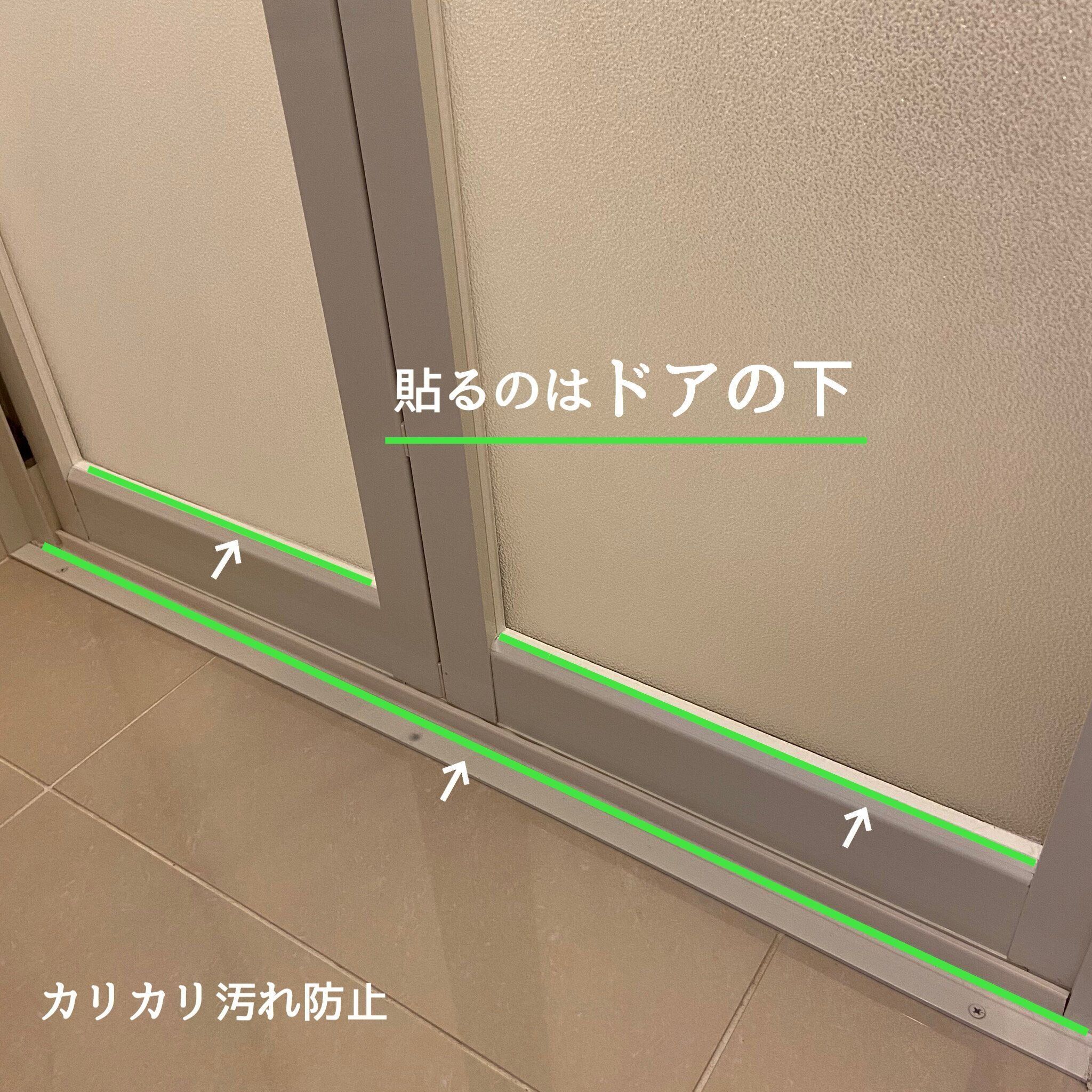 汚れ防止はこんな風にお風呂のドアに使っています。マスキングテープを剥がすだけで簡単に汚れをリセットできます。