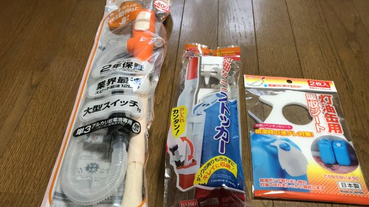 これまで手動式のポンプを使っていましたが、何度もシュポシュポするのが面倒でした。今回ご紹介したDAISOのポンプは安価ですし1分くらいで給油が終わります。これまで3分くらいかかって手動で握力を使いながら給油していたのがバカらしく感じるほど、作業性がよいです。自動停止機能がついていますが、壊れたら…と思うと心配なので給油が終わるまで側で見守っています。