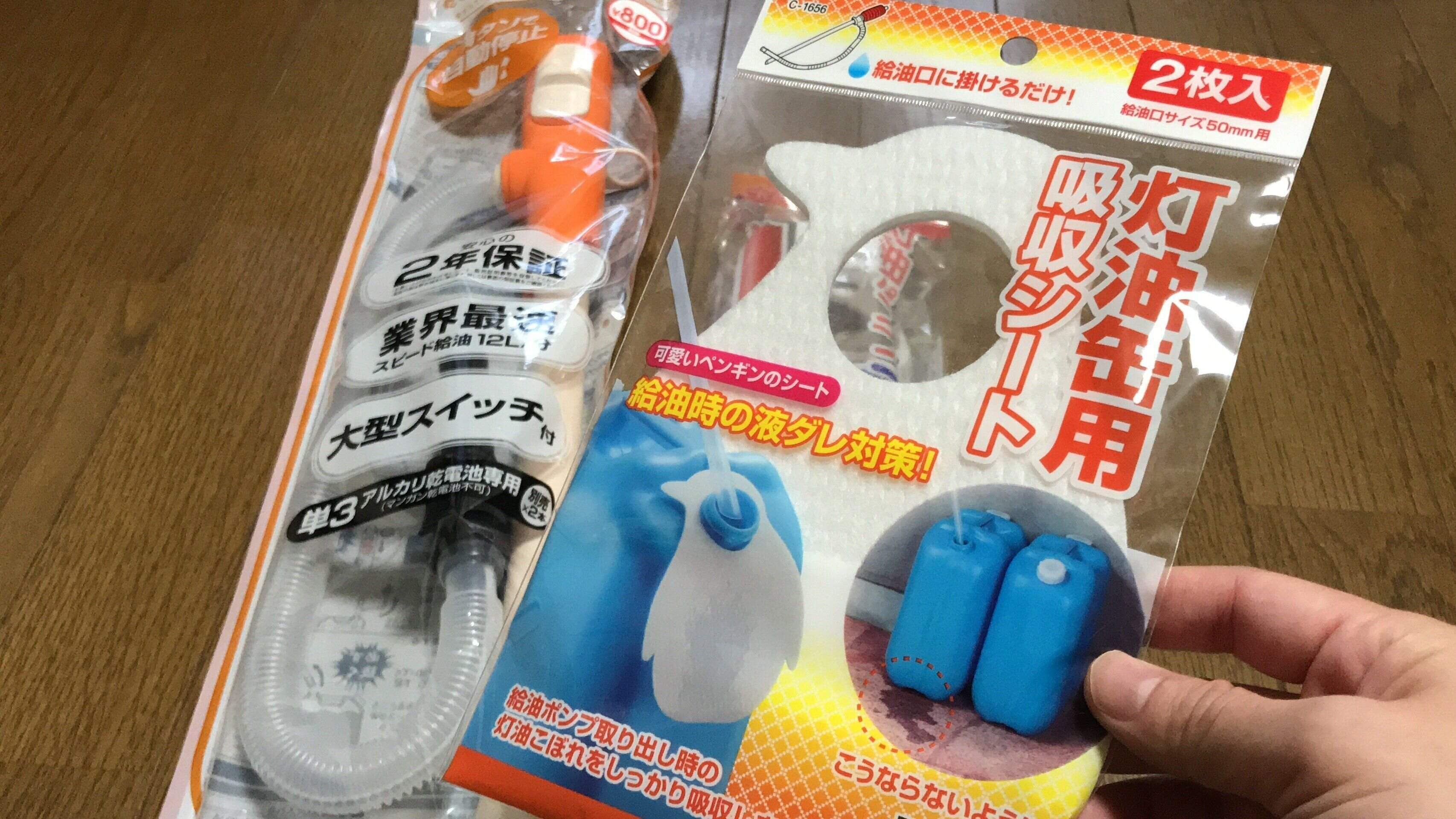 灯油ストーブの関連グッズも購入しました。電動式の灯油ポンプストッカーも1個100円で購入することができました。灯油ポリタンクのキャップを外し、ストッカーを取りつけるだけで、スマートに灯油グッズを収納できます。
