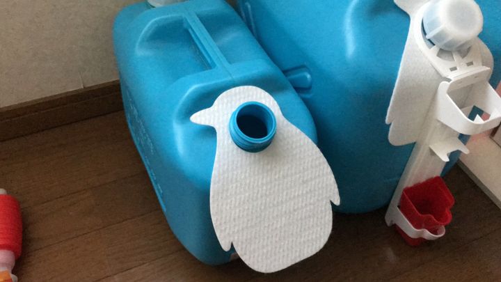 ペンギンデザインの吸収シートは1セットに2枚入っています。厚みがあるシートで、給油ポンプ取り出し時の灯油こぼれをしっかりと吸収してくれます。ありそうでなかった!気が効くなぁと感心したアイテムです。吸収シートをつけておくと、床に灯油がこぼれるのを防いでくれるので掃除がラクです。