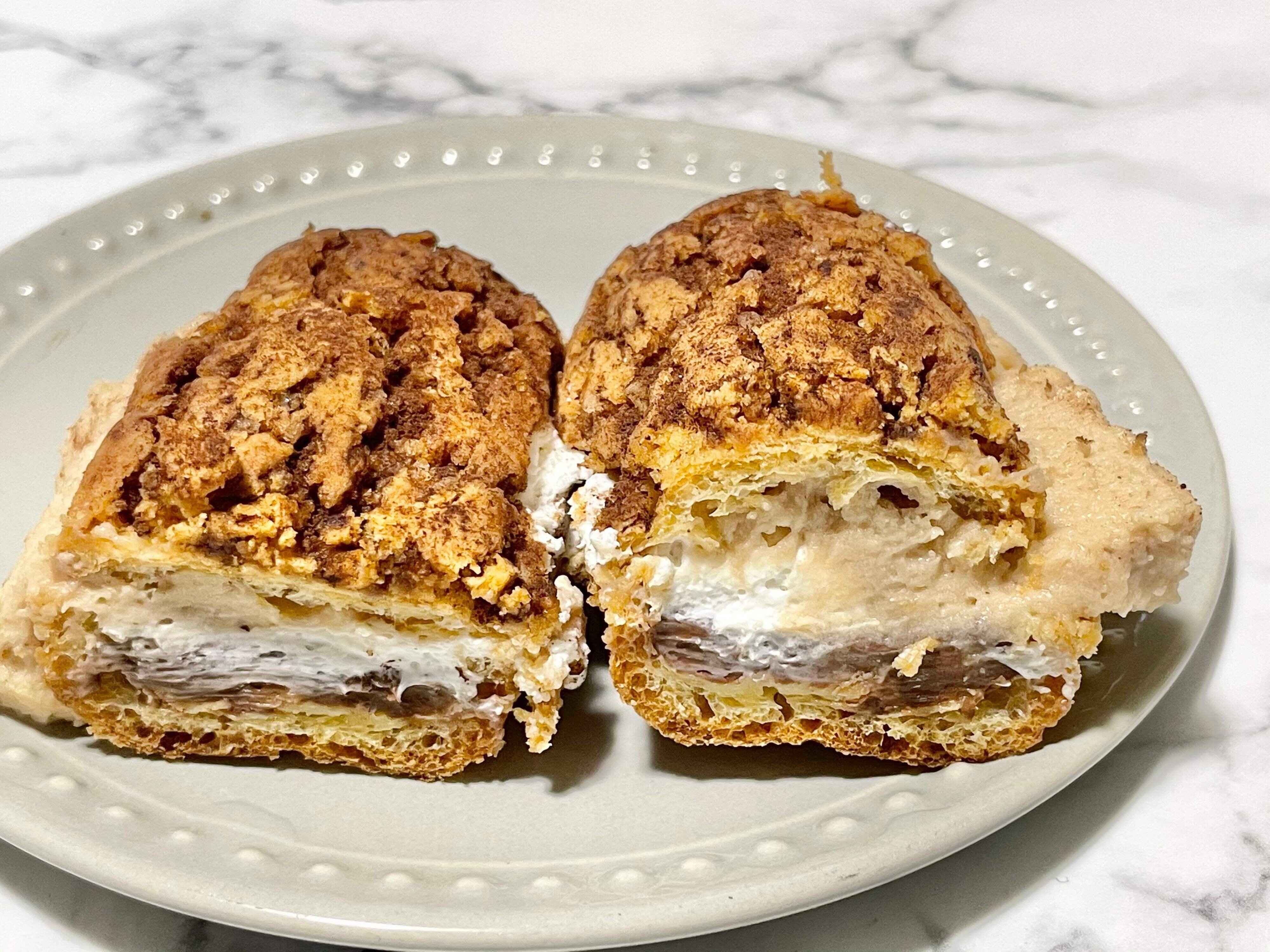 半分に切ってみると、クリームが柔らかく広がってしまいました。クリームがぎっしりと入っていて食欲をそそります。