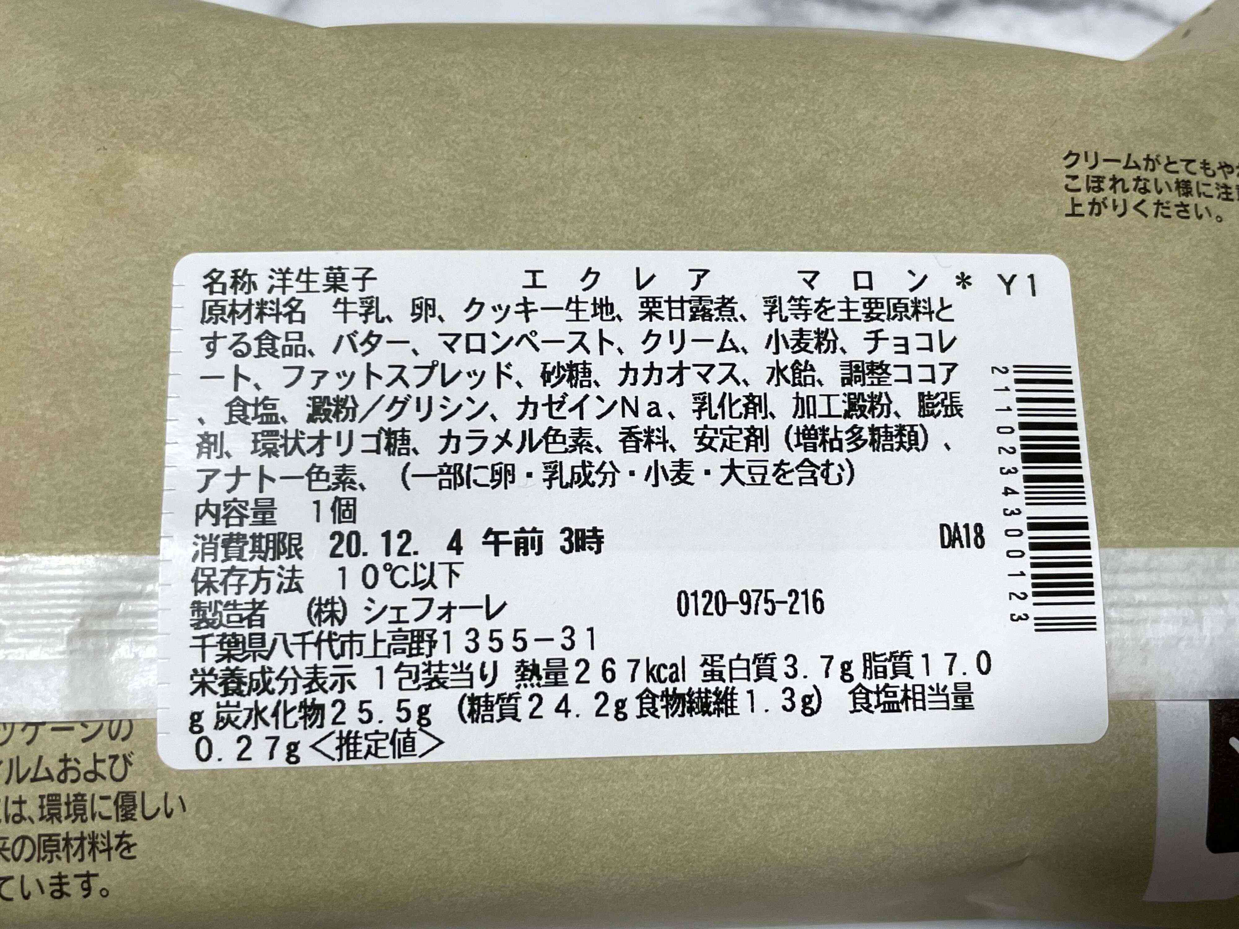 1個あたり267kcalと、小さめながらなかなかの高カロリー…マロンにショコラが入ったエクレアなので妥当でしょうか。茶碗一杯分のご飯と同じくらいありますね。