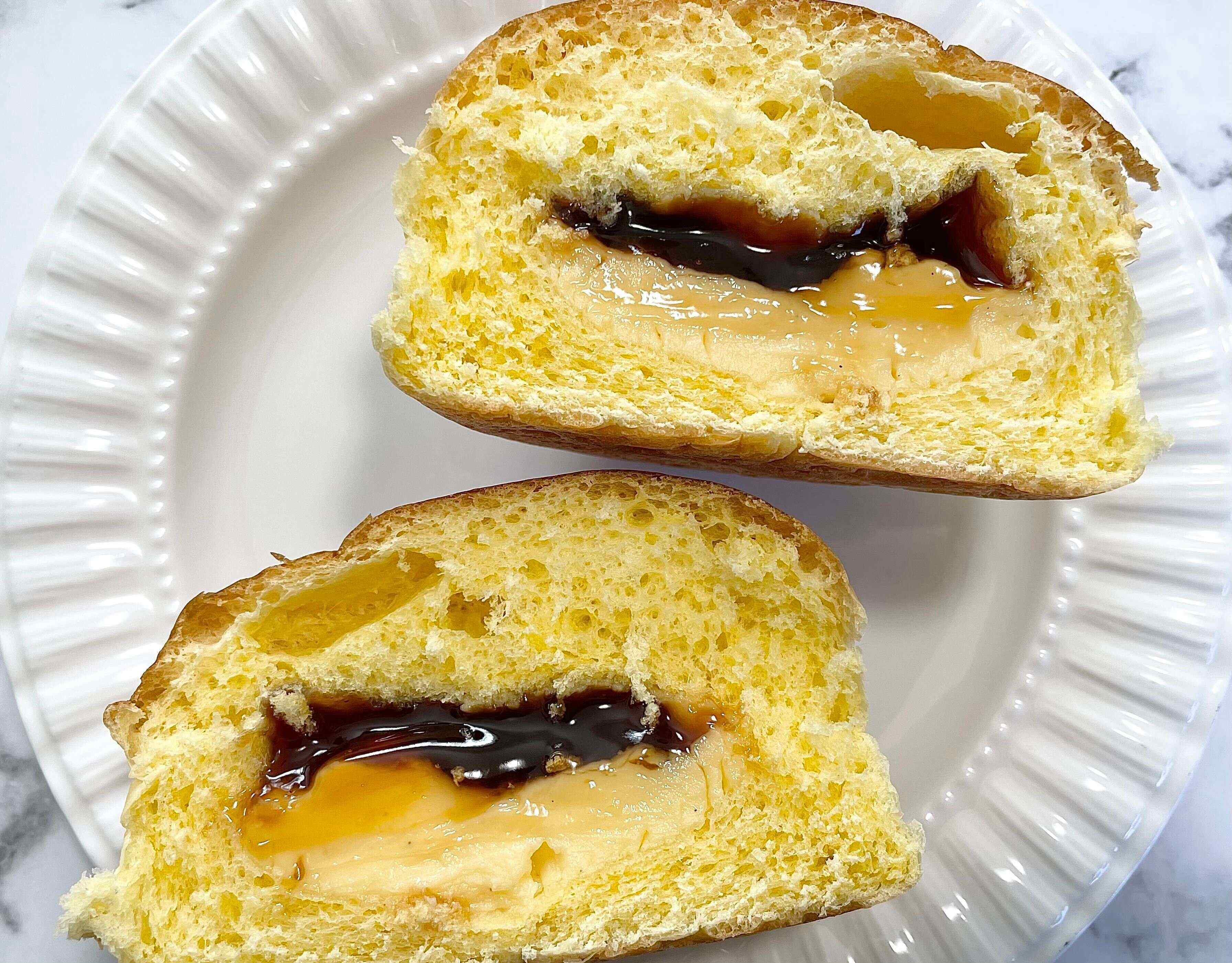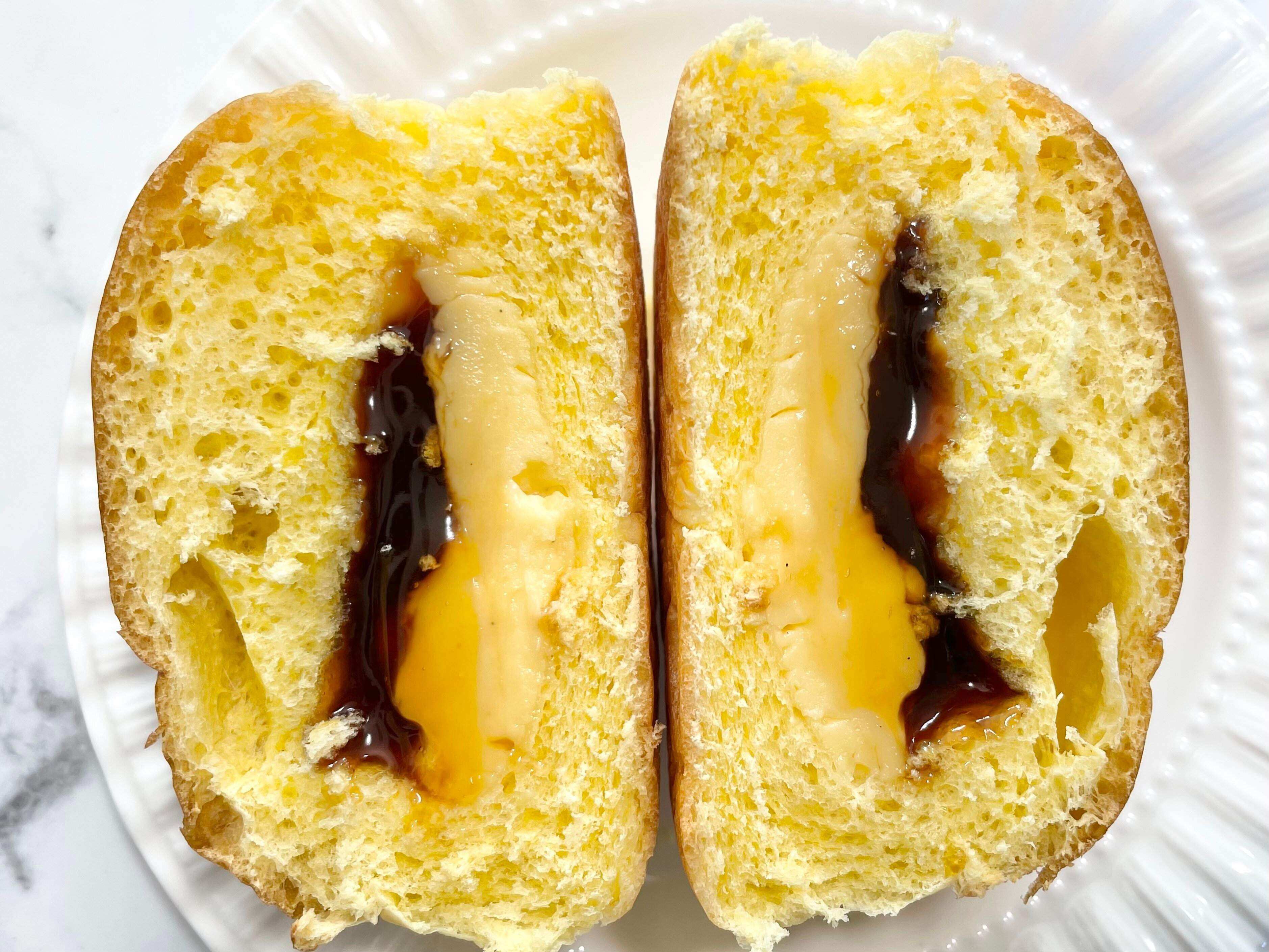 半分に切ってみると、とろ~りとしたキャラメル風味ソースとカスタードクリームが出てきました。カラメル風味ソースが思った以上にほろ苦くしっかりと量が入っているのでプリン感がでています。