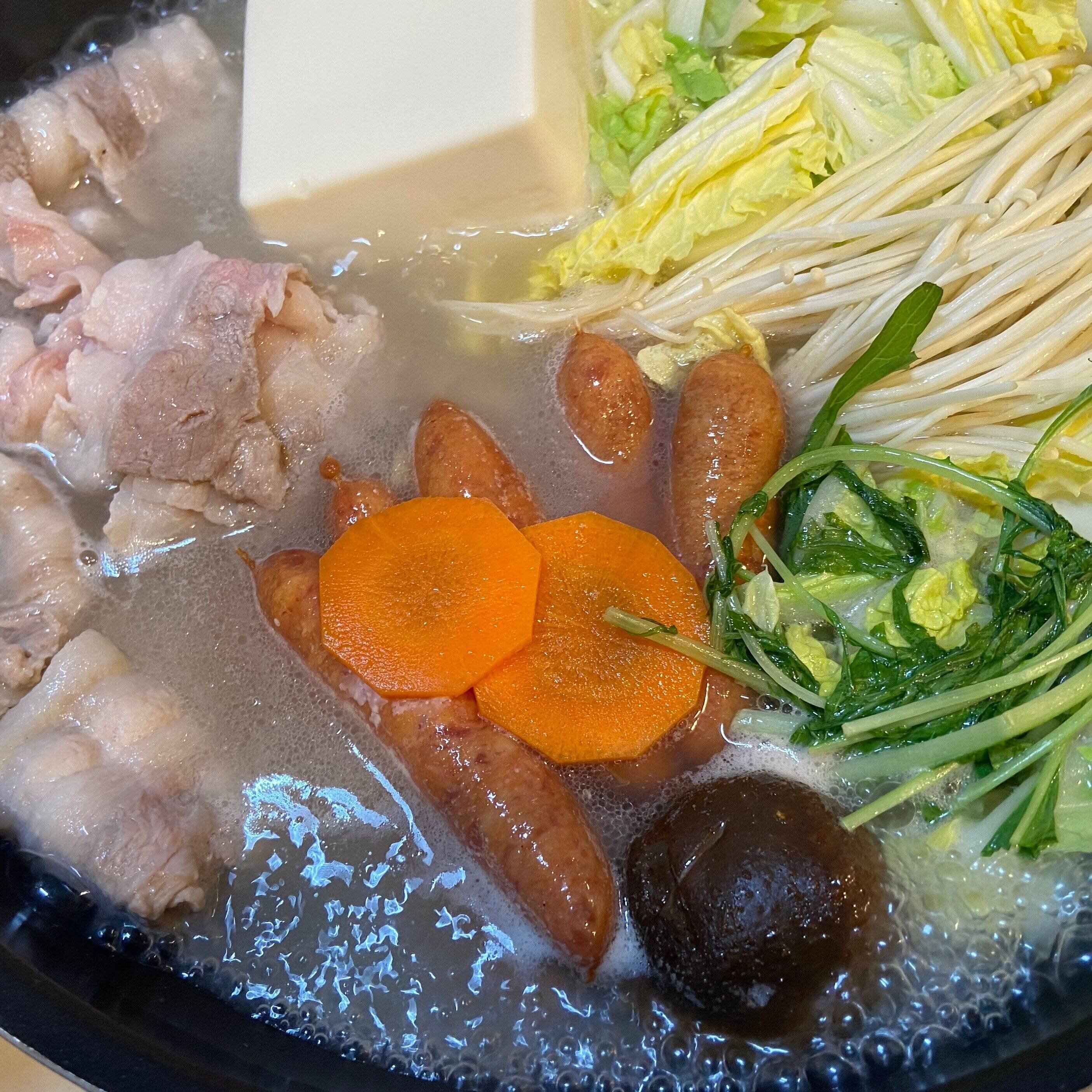 わが家では白菜、にんじん、きのこ類、水菜、豆腐に豚バラと鶏団子、えびを使いました。