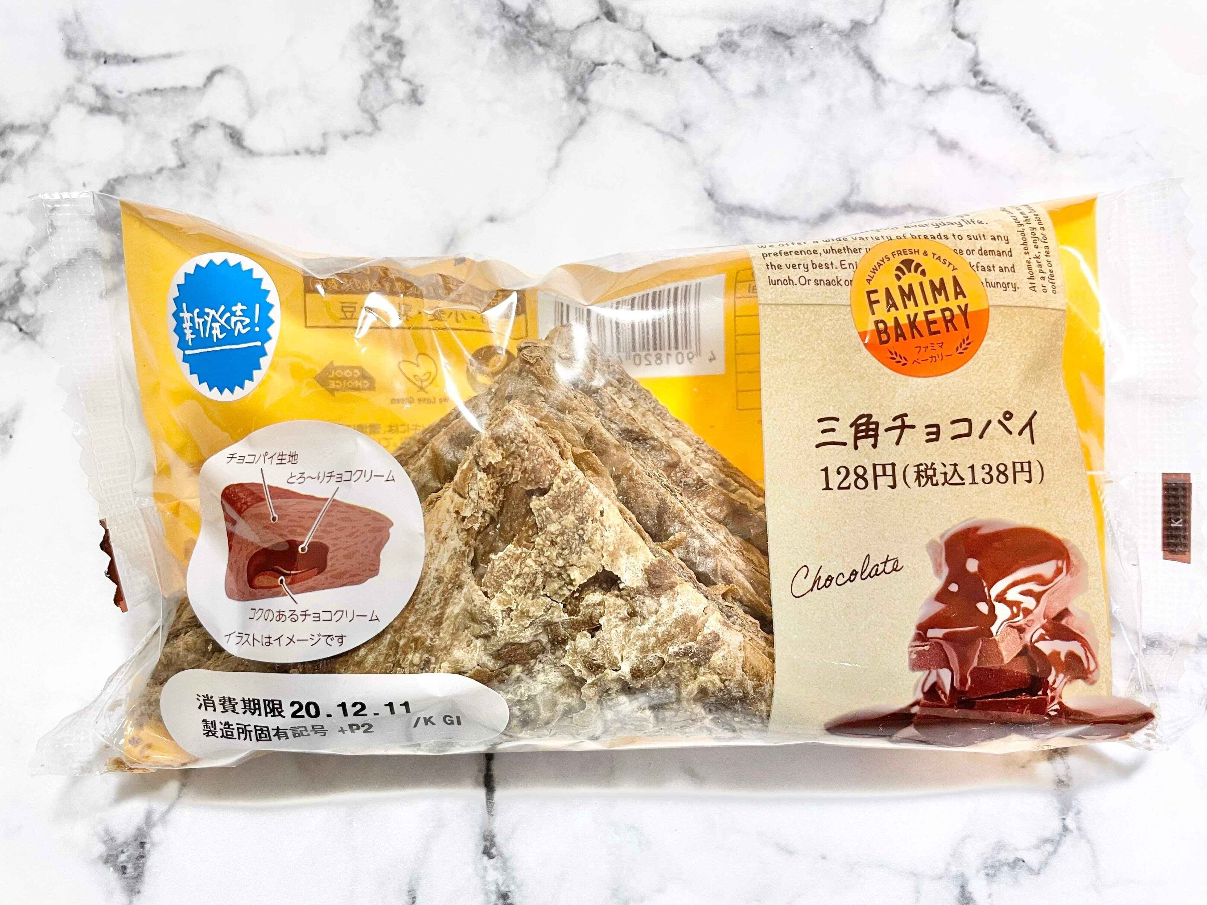 ファミマで買い物している途中に見つけた「三角チョコパイ」。厚みがあり、パッケージのイラストが目を惹きました。