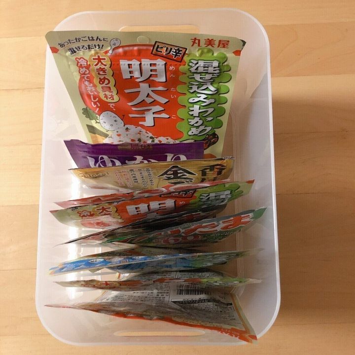 この2つを組み合わせると、ふりかけなどの小袋を倒れずにすっきり収納することができます。