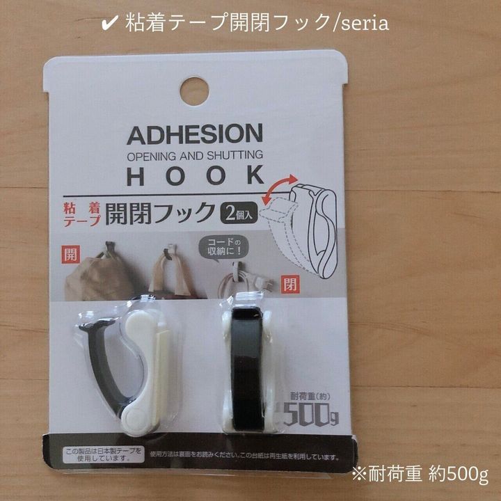 こちらは接着面が粘着テープになっていて、耐荷重が約500g!手軽に物が引っ掛けられるので重宝しています。
