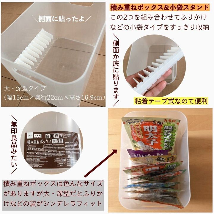 積み重ねボックスはサイズが色々ありますが大・深型だとふりかけなどの袋がシンデレラフィットしますよ。これだとすっきり収納できて取り出しやすいのでおすすめです。