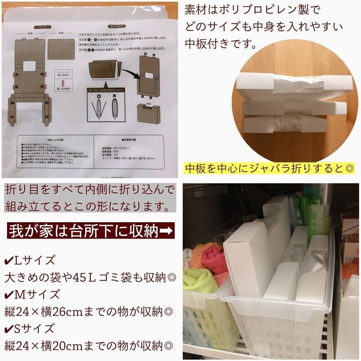 素材はポリプロピレン製で、どのサイズも中身を入れやすい中板付きです。
