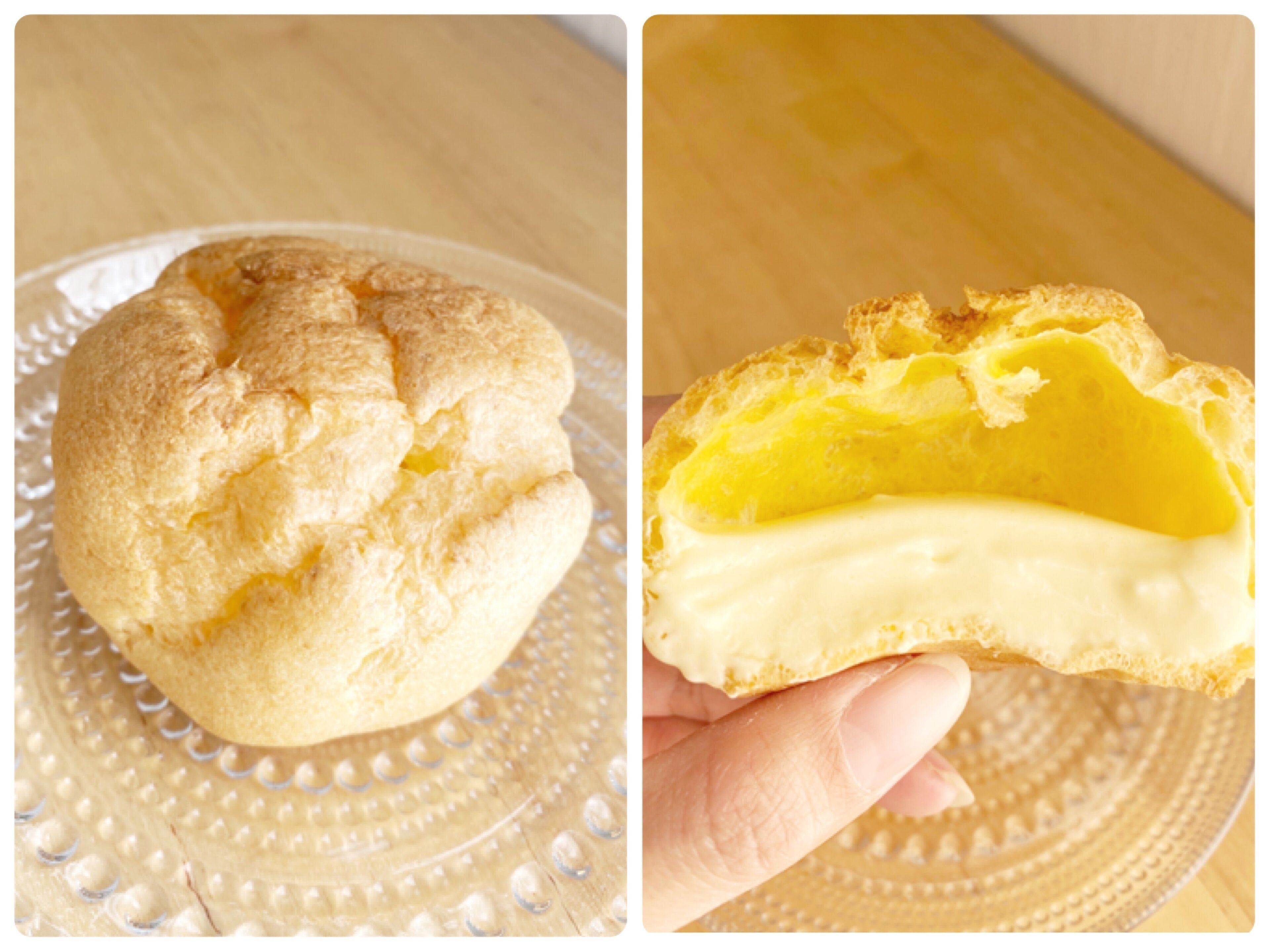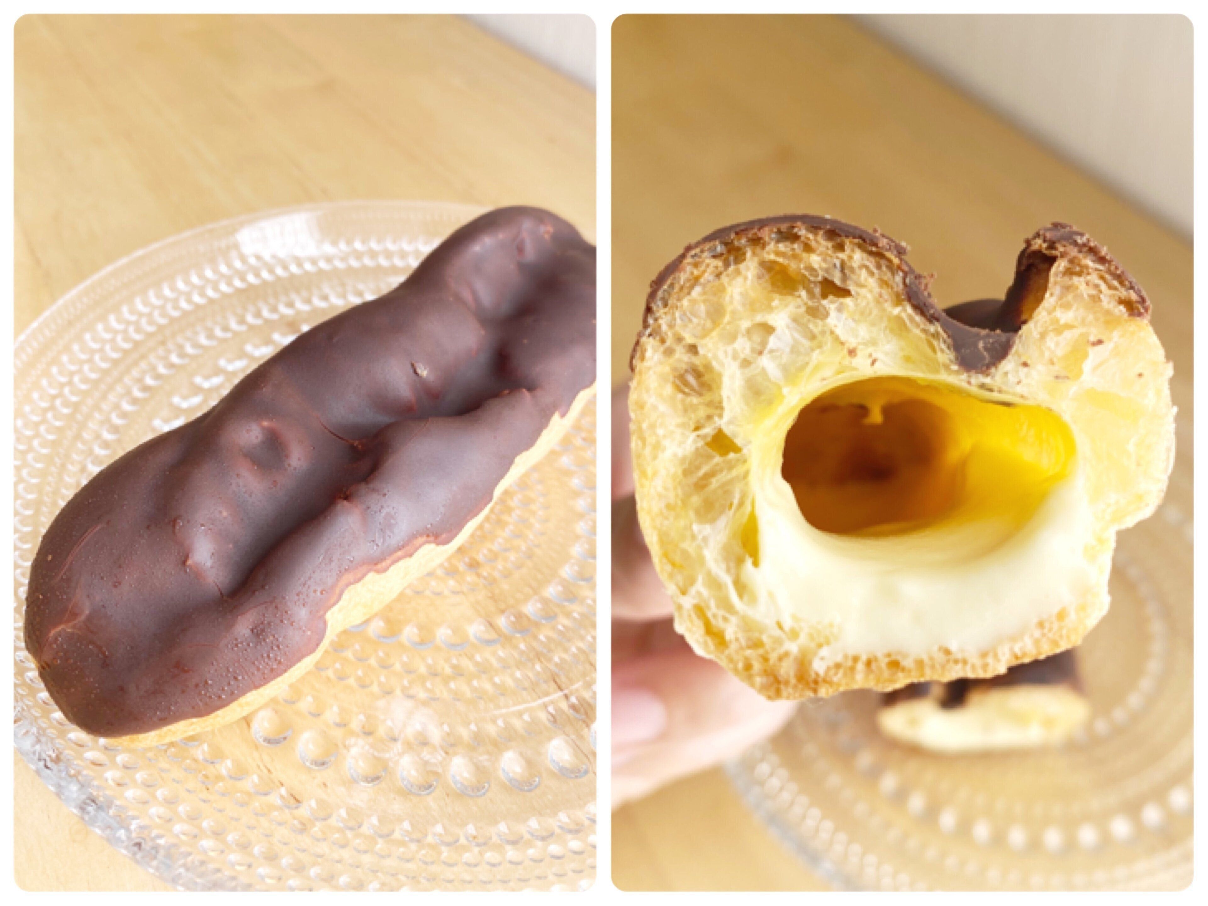 シュークリームより分厚くかたい生地になっています。中のカスタードクリームは少なく甘さひかえめですが、チョコレートコーティングが甘いのでよいバランスになっています。食感とチョコレートが満足度を上げてくれるスイーツです。