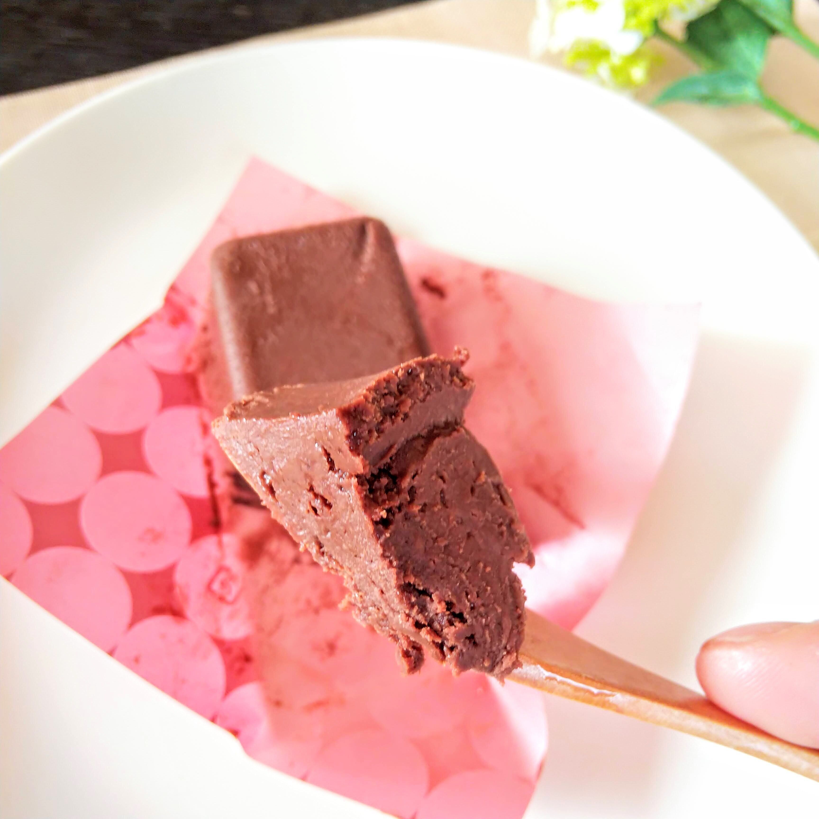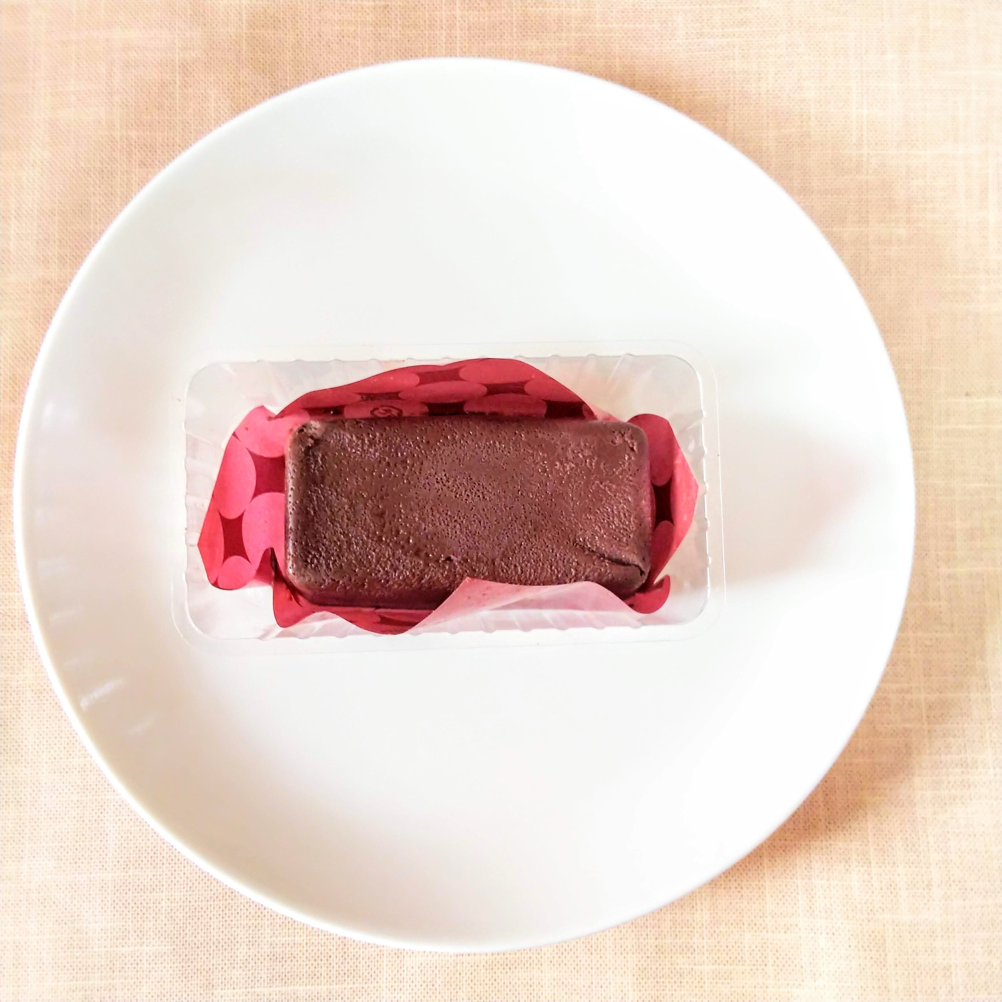 あけてみると、少し硬そうなチョコケーキという感じですが、実際にフォークを刺してみるとさくっと入りました。