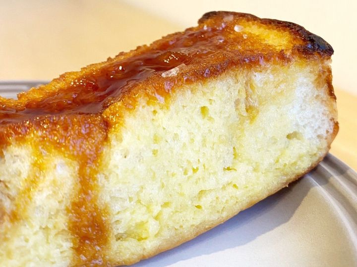 中心部までしっかりしみこんだフレンチ液は卵の素朴で優しい味わいです。カラメルは甘い中にもほろ苦さを感じる奥深い味わいになっていて、甘さ控えめのフレンチ液とよく合います。ブリオッシュ生地のずっしりした弾力も食べごたえ抜群ですよ◎