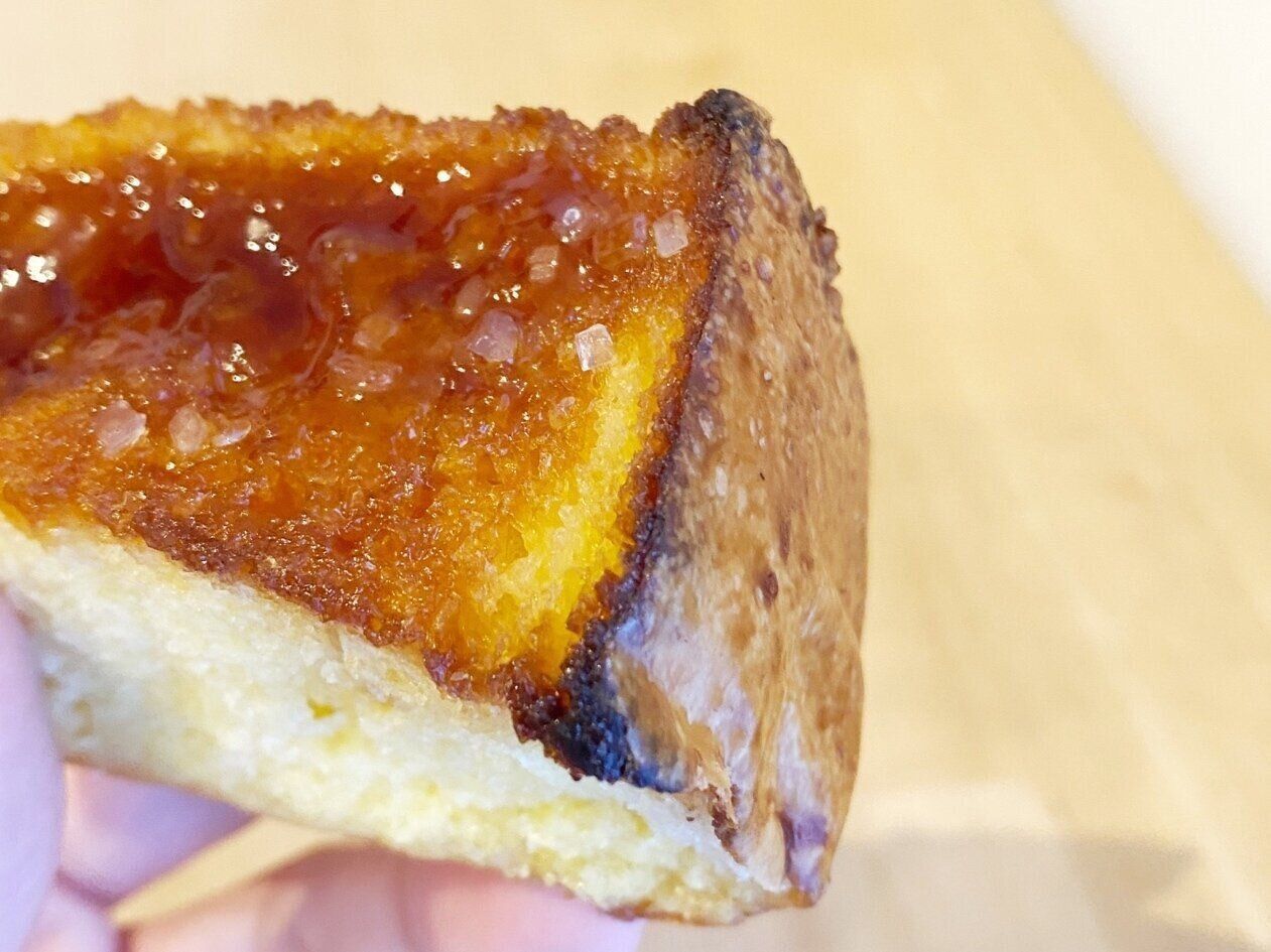 約2.5センチの厚みのブリオッシュ生地の表面にはたっぷりのカラメルソースとザラメがのっています。カラメルの甘い香りが食欲をそそります!