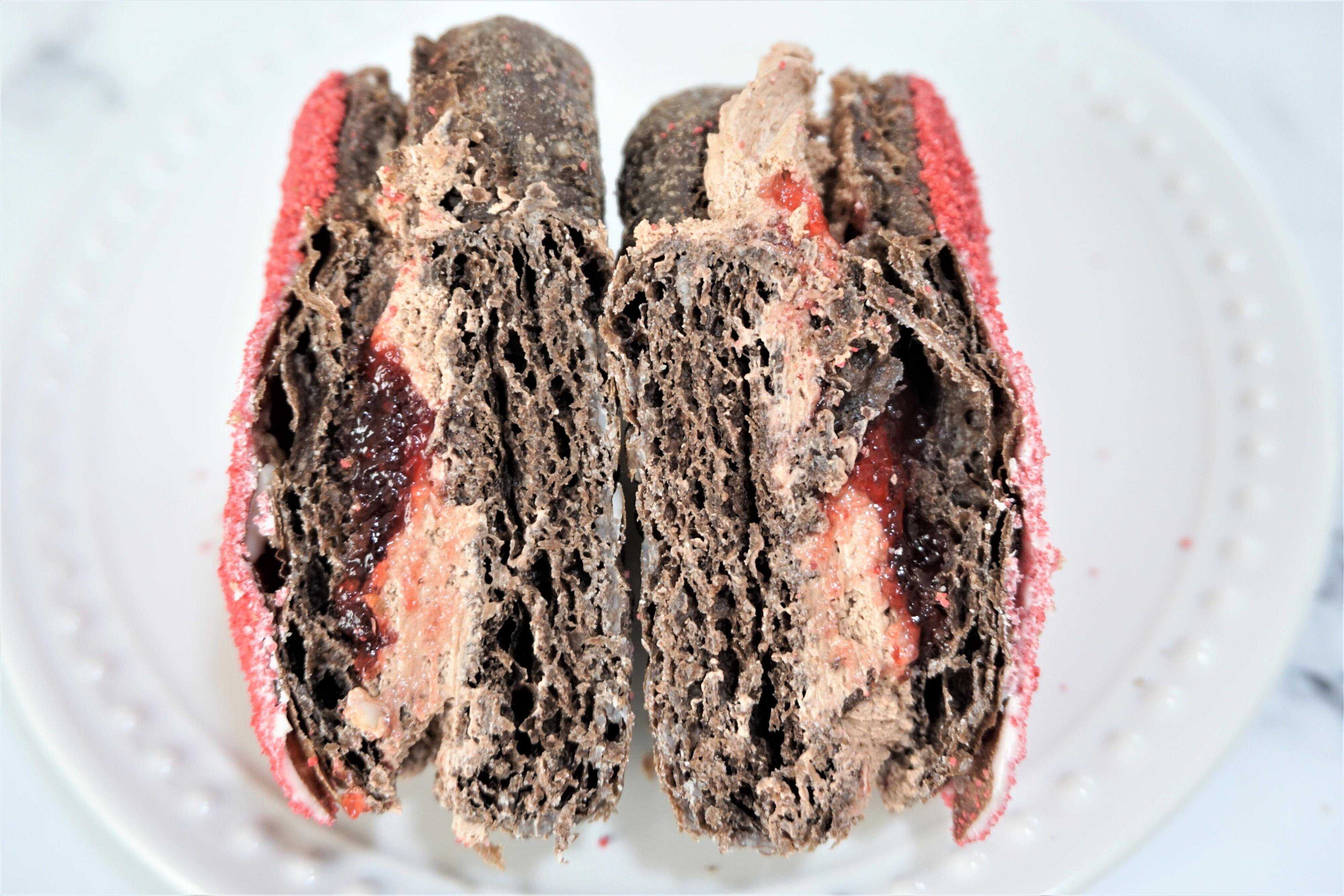 ココア風味のデニッシュ生地にガナッシュホイップとフランボワーズフィリングを挟み、フランボワーズシュガーでコーティングしています。