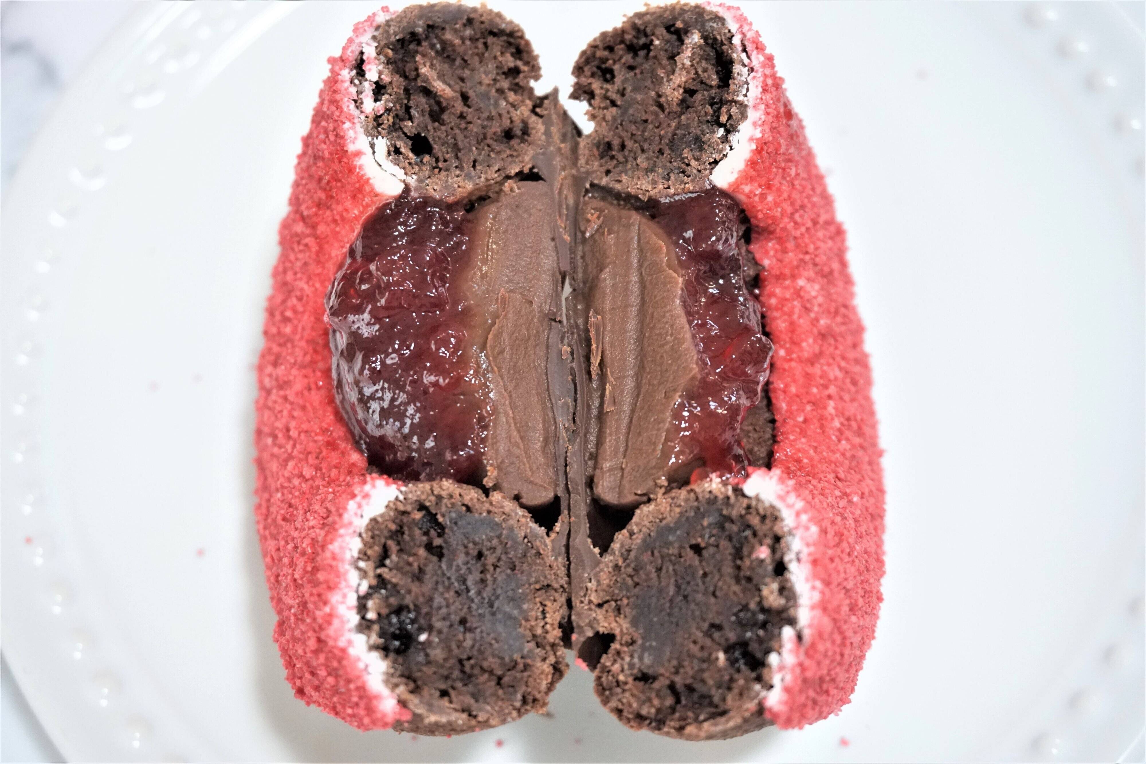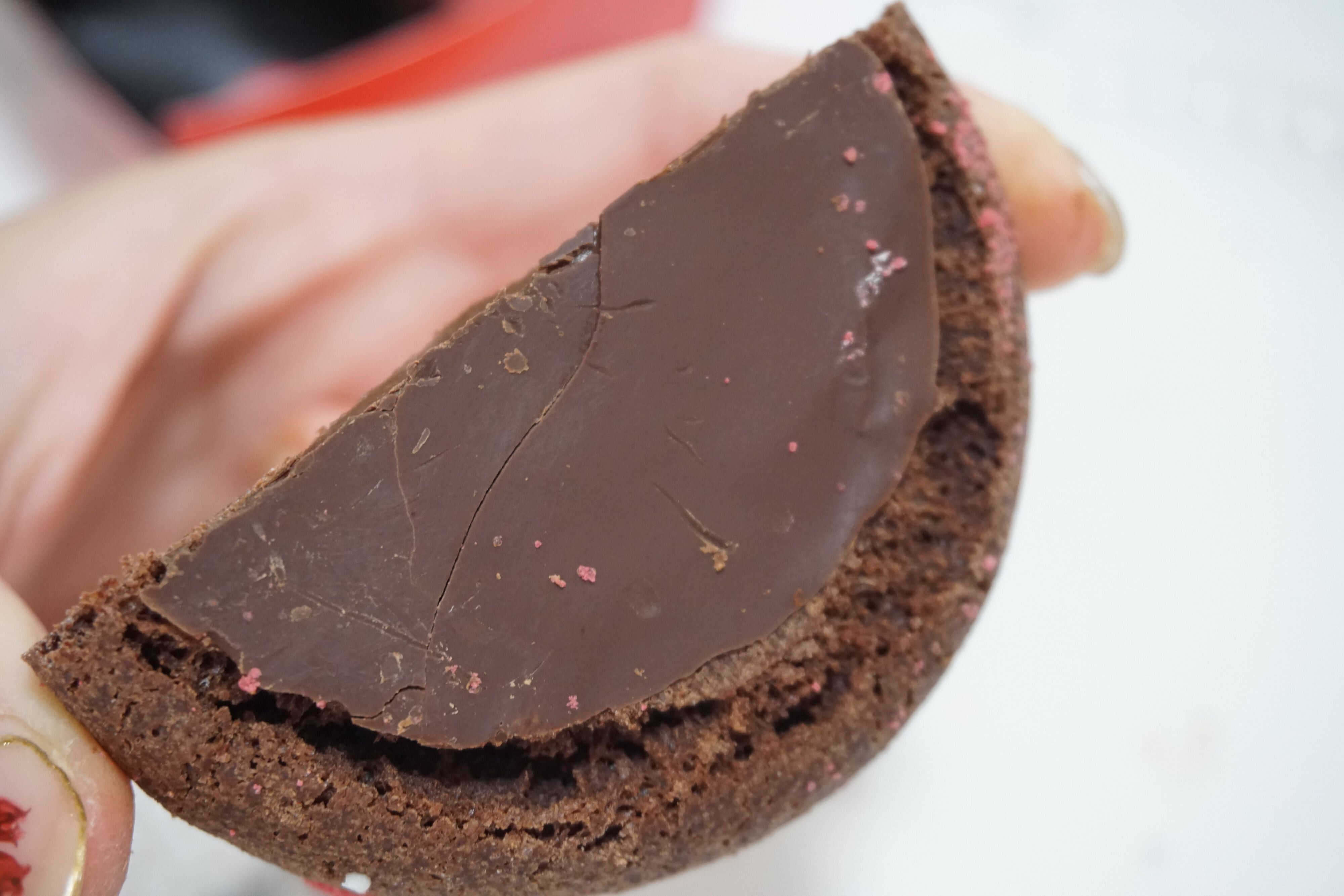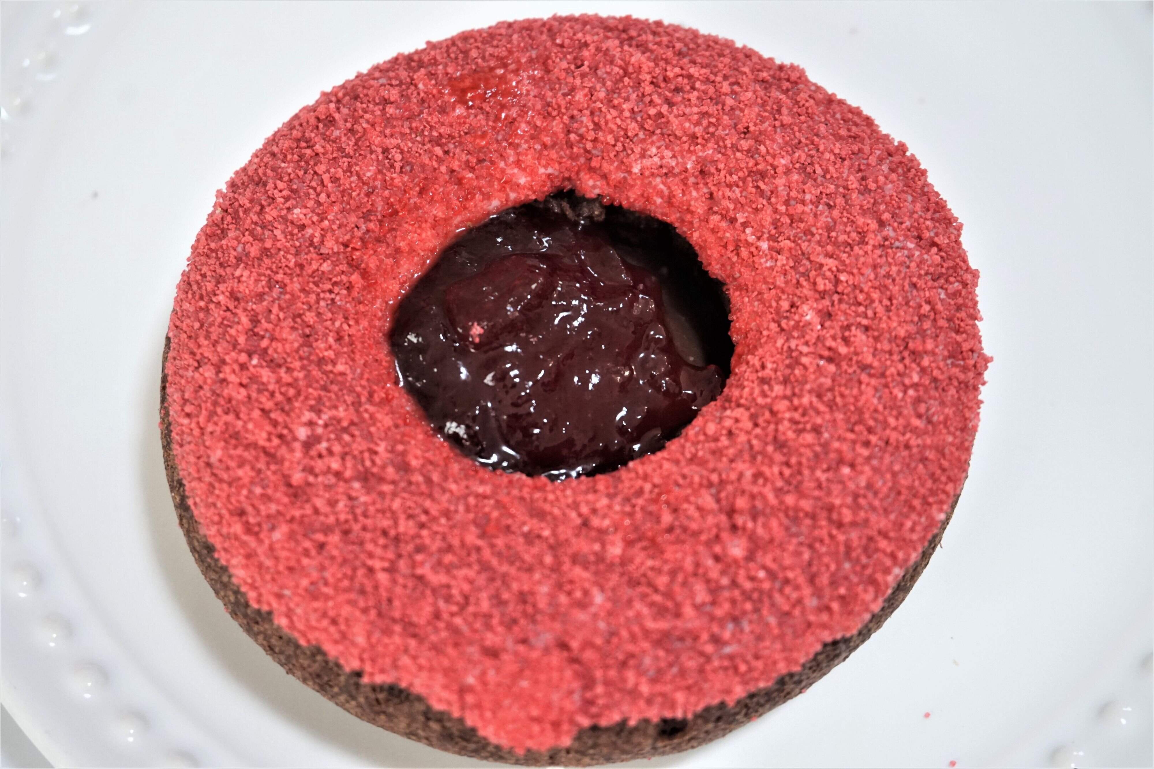 しっとり濃厚なチョコレートドーナツ生地の真ん中にガナッシュクリーム、フランボワーズフィリングが入っています。