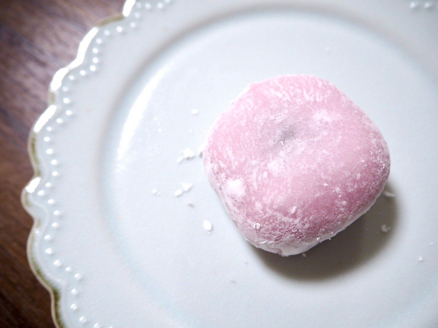 大福というと外側の部分は白のイメージですが、淡いピンク色がかわいらしい。サイズは頑張れば1口で食べられそうな手のひらサイズです。