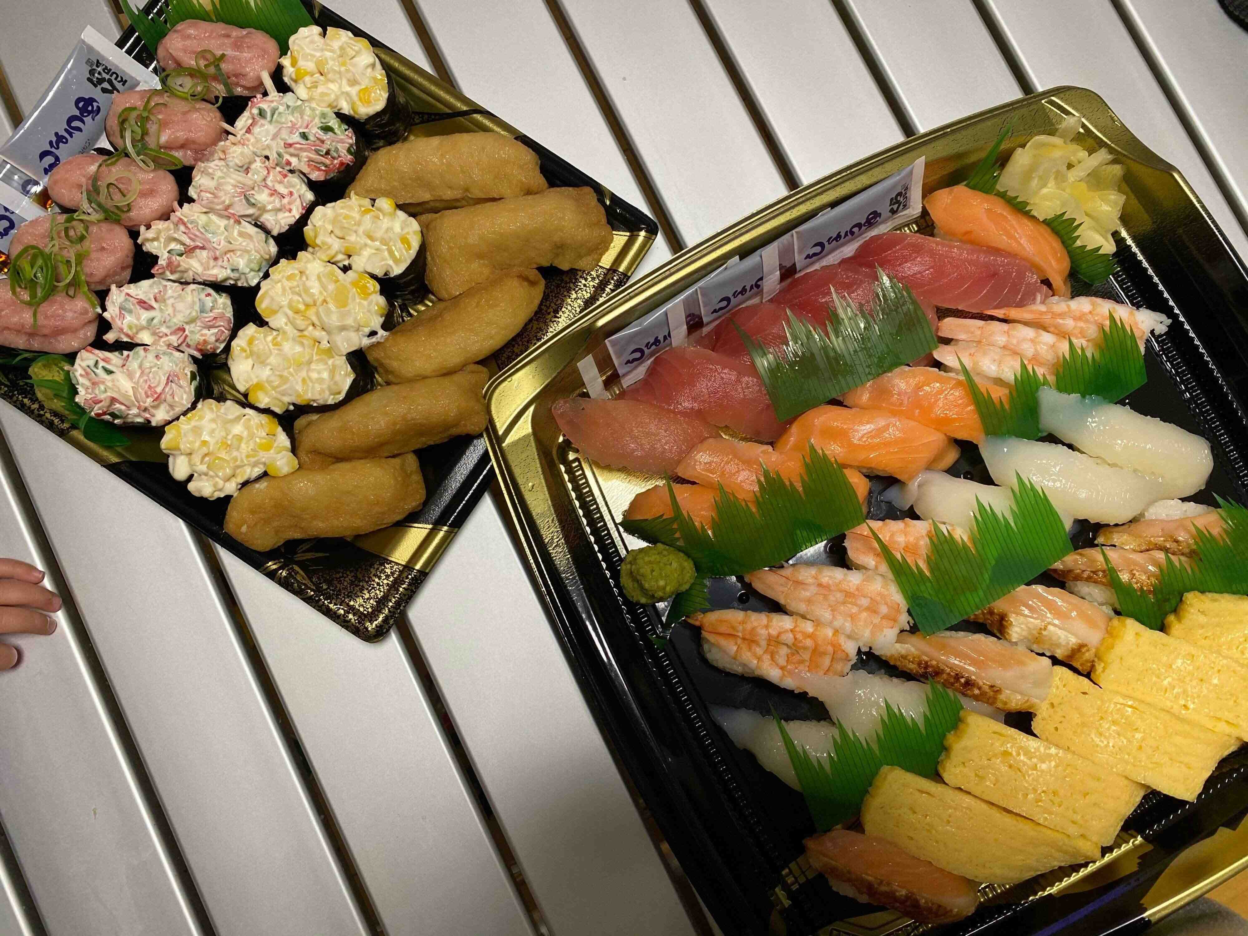 まぐろ 、サーモン 、尾なしえび 、たまご 、真いか 、焼きはらす 、いなり 、ねぎまぐろ 、コーン 、サラダの10種類が5貫づつ入っています。