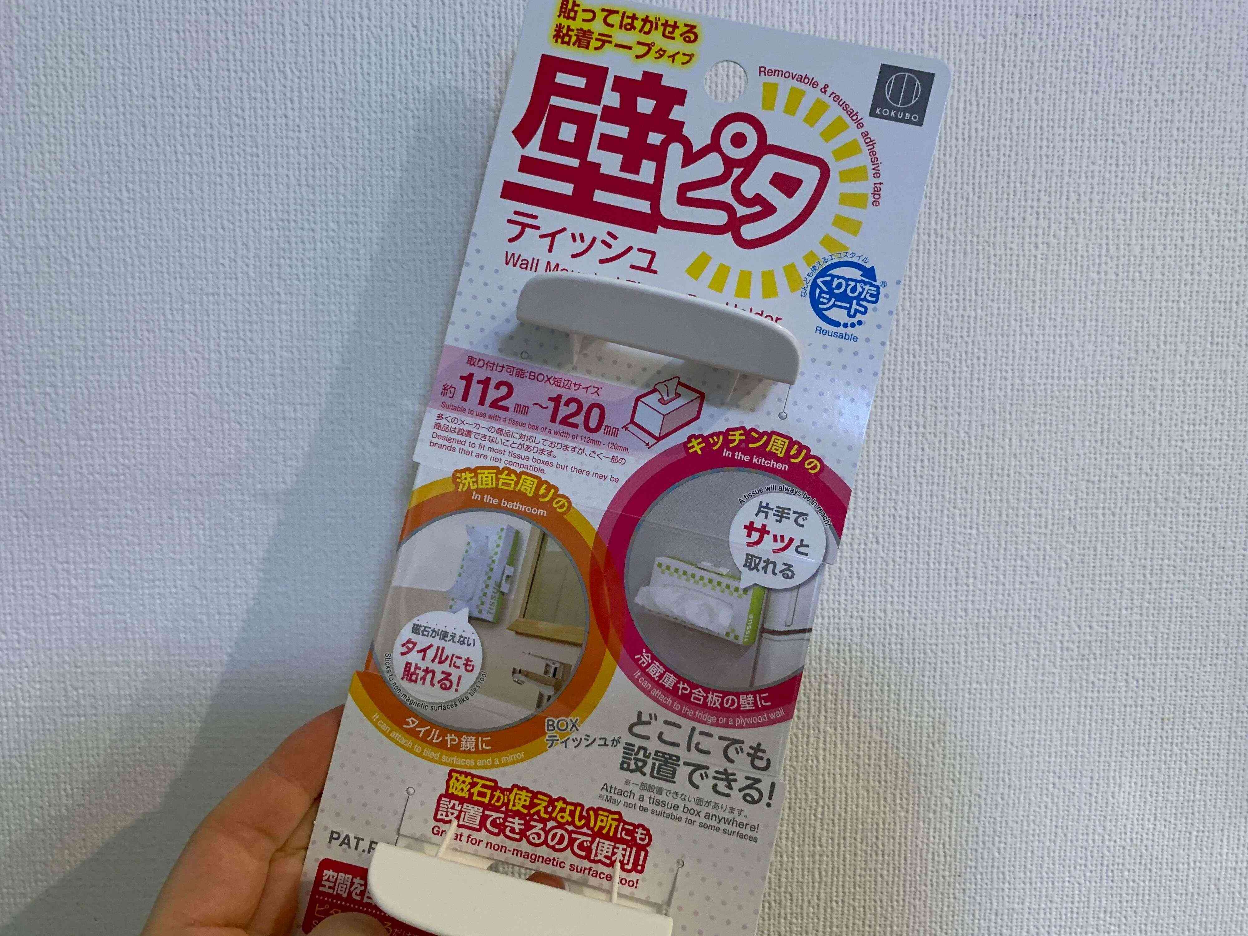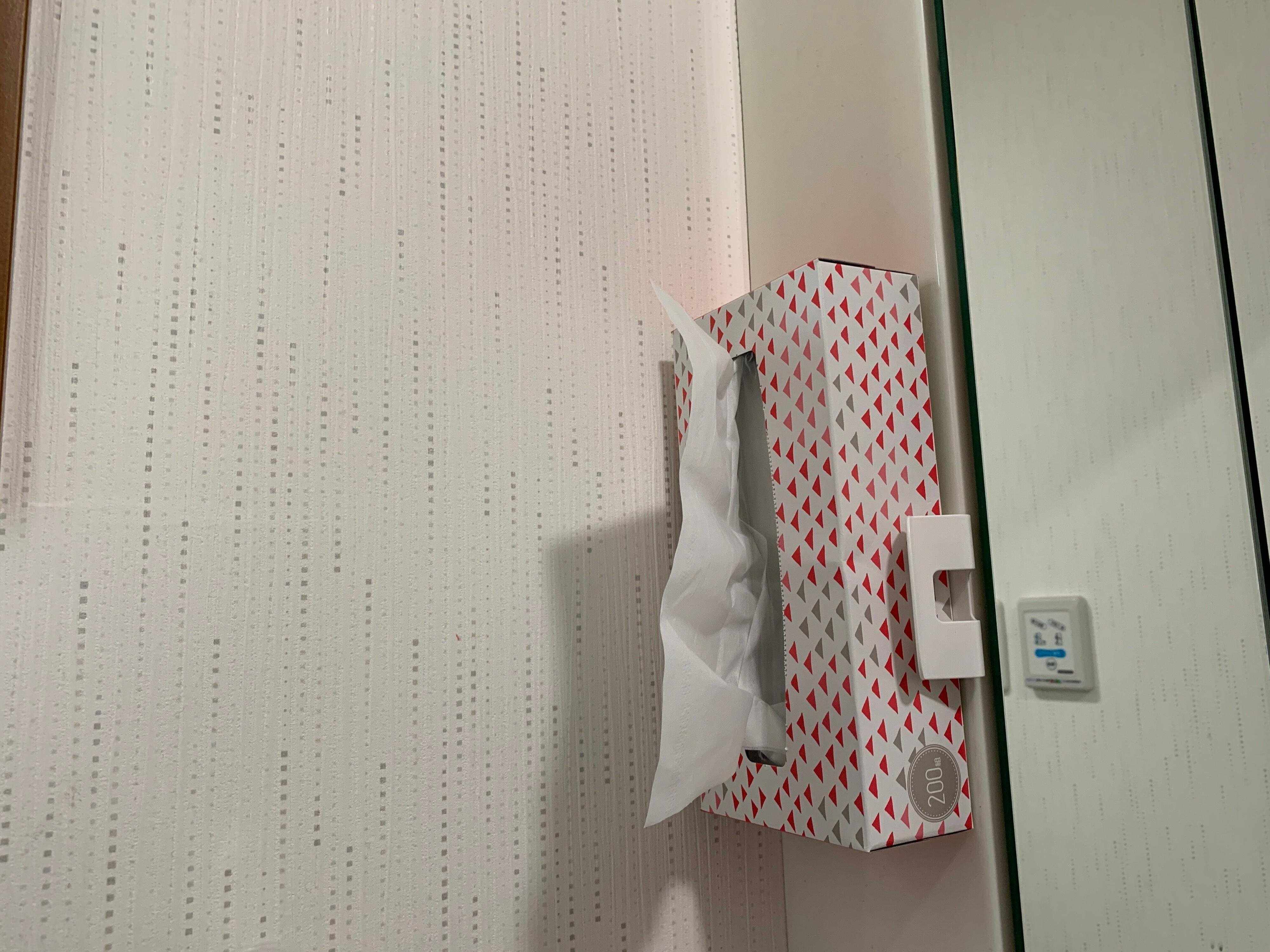 ティッシュ箱を壁につけられるアイテム。ティッシュ箱を挟んでいるだけなので、箱自体も一瞬で交換できます。