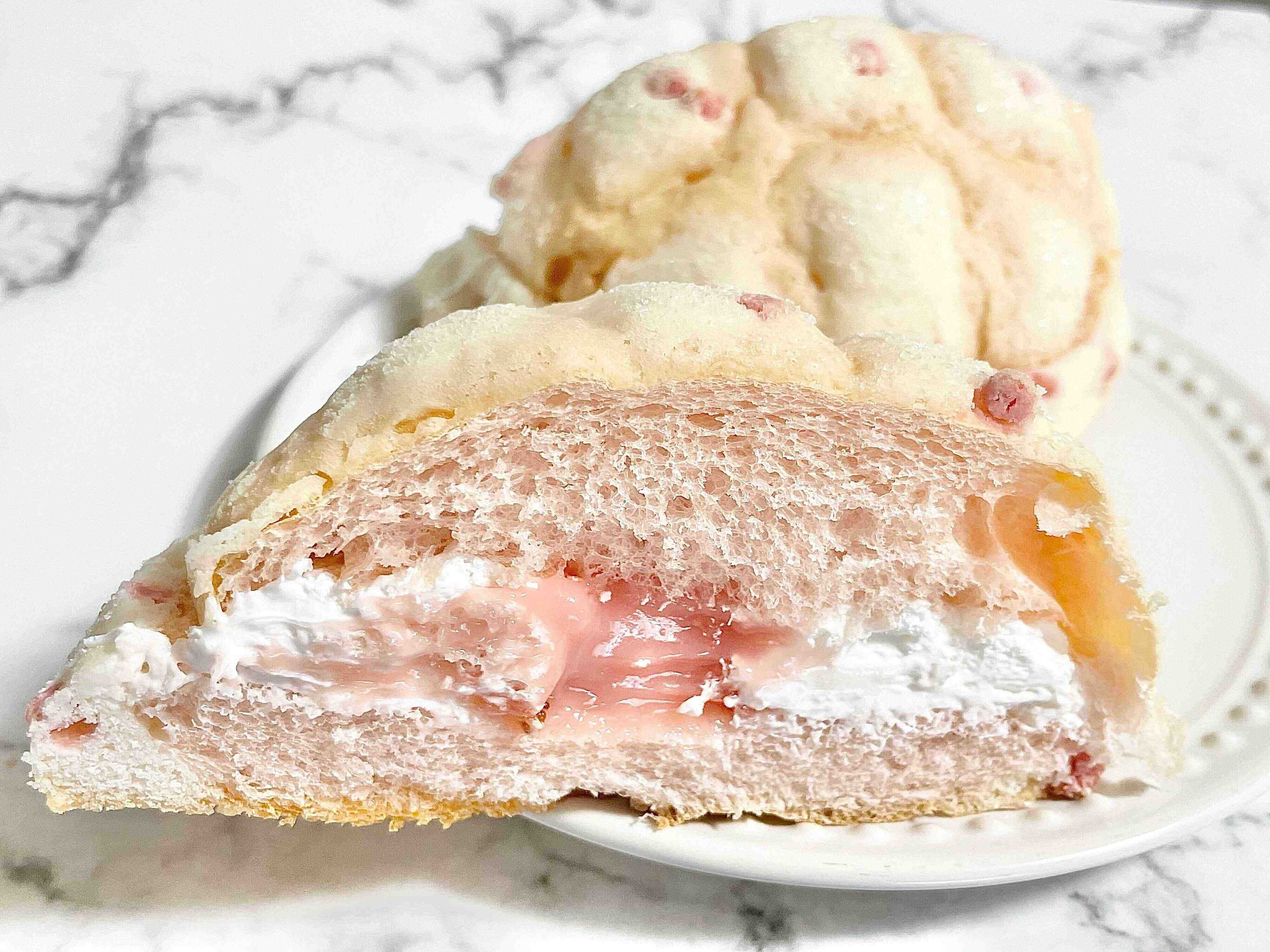 いちご風味のチョコチップをいちご風味のパン生地に入れ、クッキー生地を被せたメロンパンです。いちごの果肉が入ったいちごクリームと北海道産牛乳入りのミルクホイップが挟まれた、いちごづくしのメロンパンになっています。