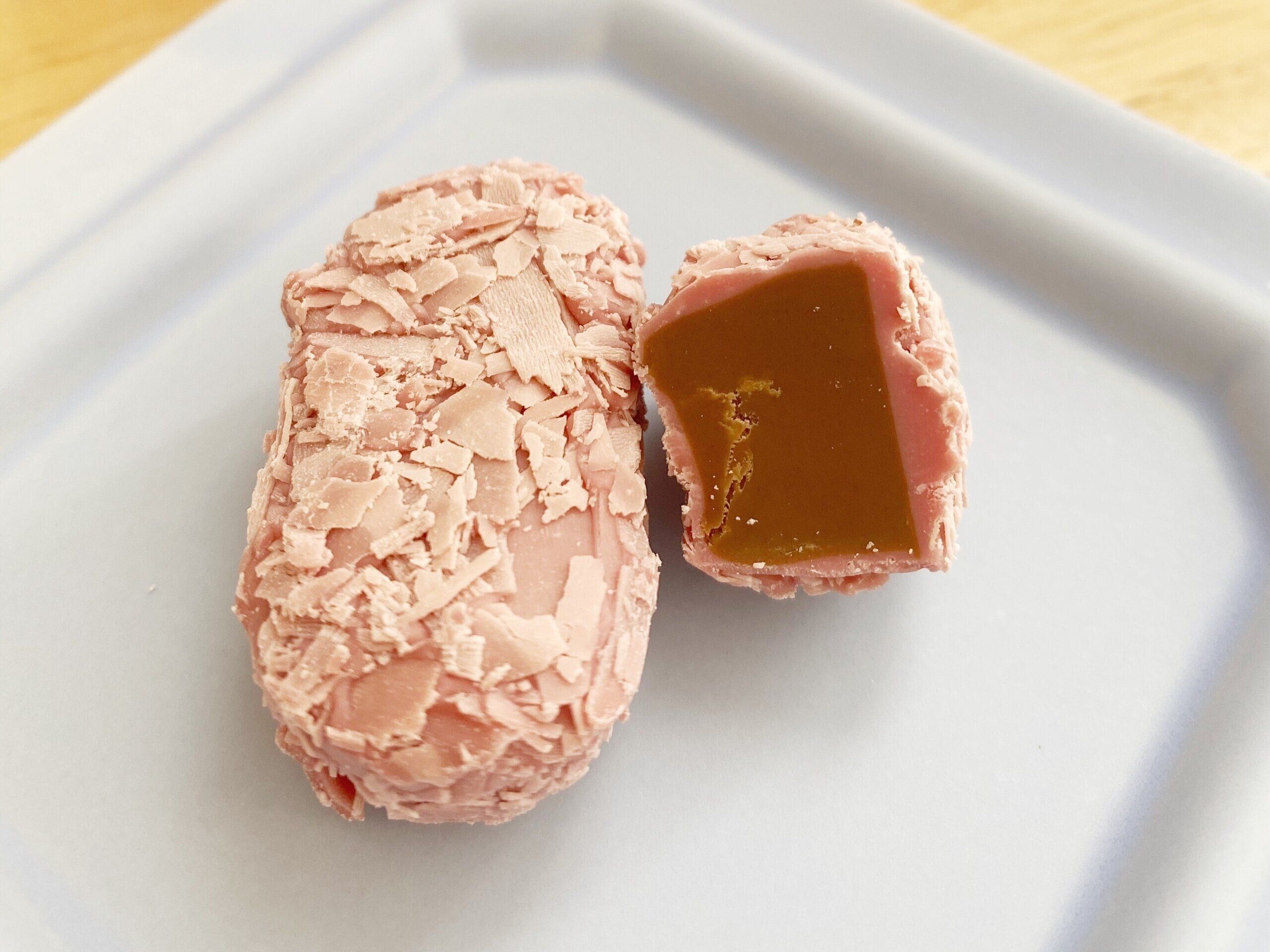 外側にコーティングされたルビーチョコレートはほんのり酸味があり、中のガナッシュチョコレートの甘さと相性抜群!口どけもよく非常においしいチョコレートです。300円台とは思えないレベルの高い商品。