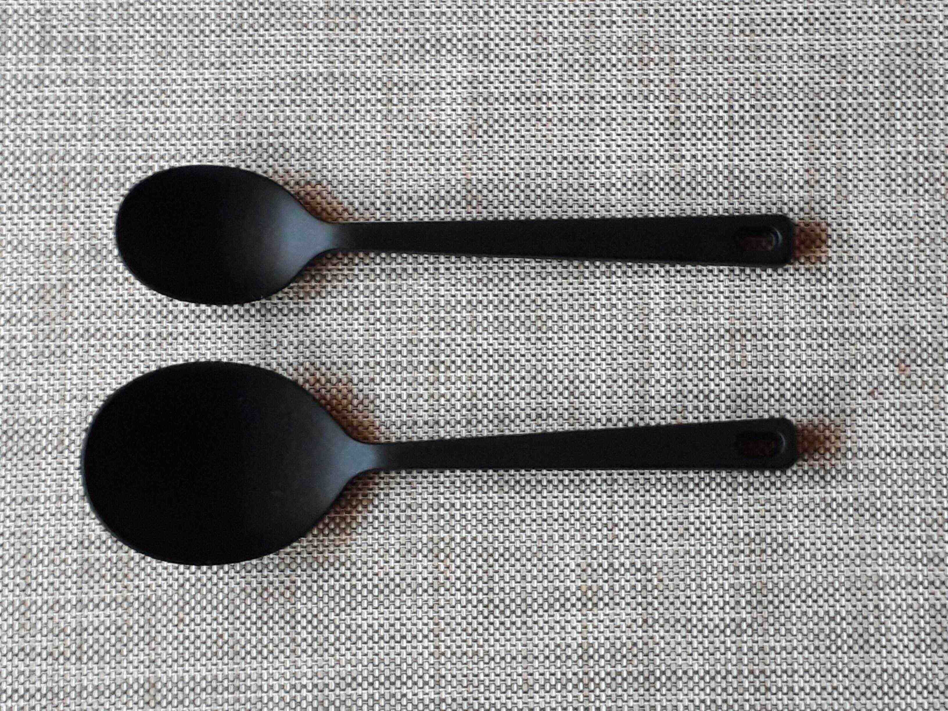 昨年、無印良品から発売されたシリコーン調理スプーンのスモールサイズ。従来のシリコーン調理スプーンは1本590円(税込み)ですが、新発売のシリコーン調理スプーン【スモール】は490円(税込み)で販売中です。写真のように、従来の調理スプーンよりひと回り小さくなっています。