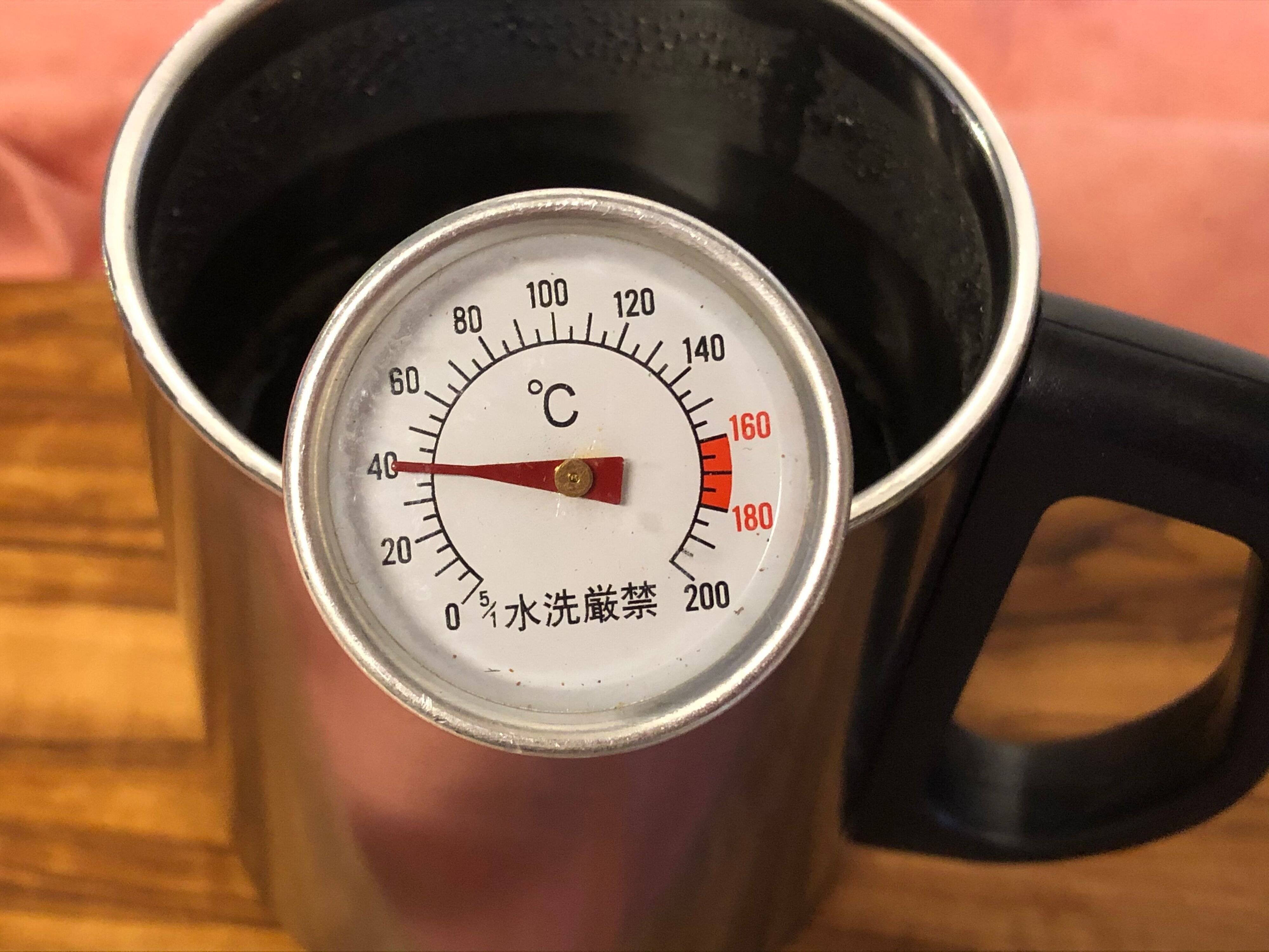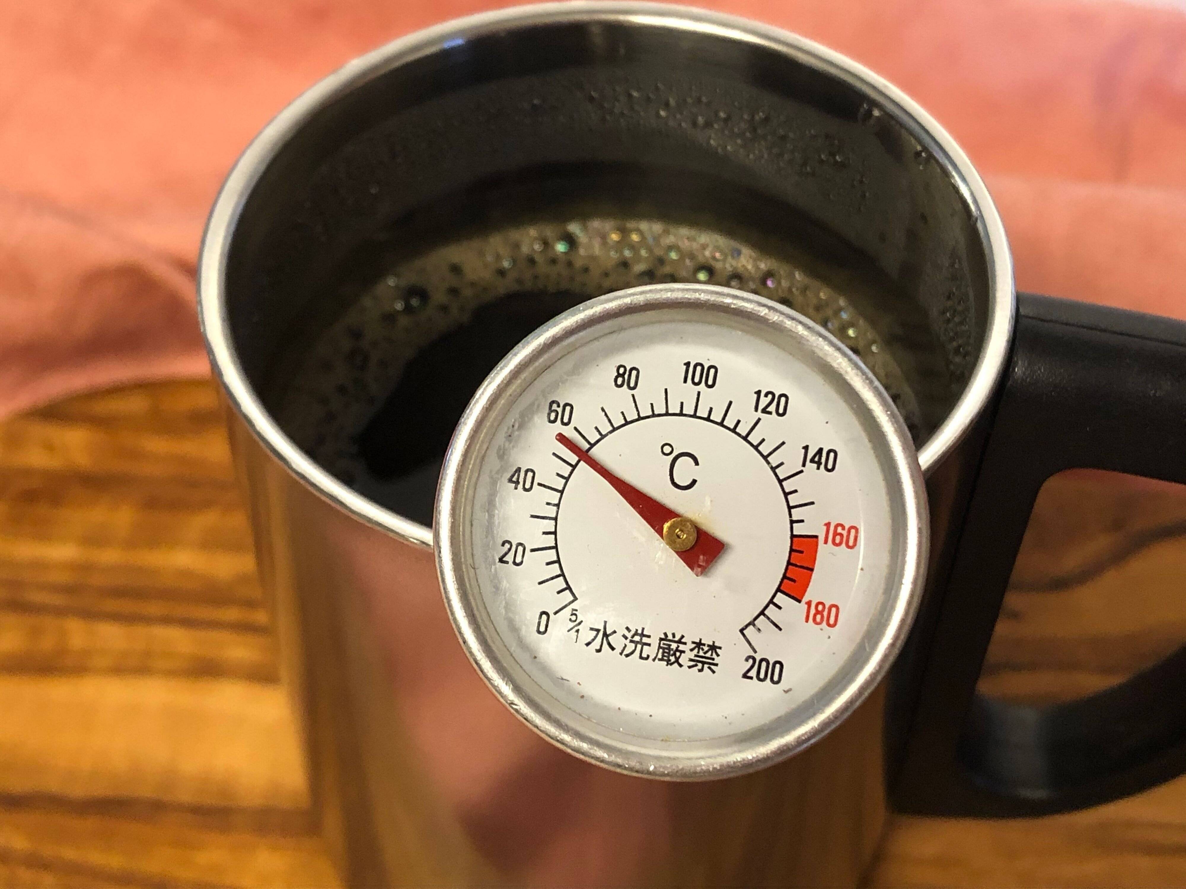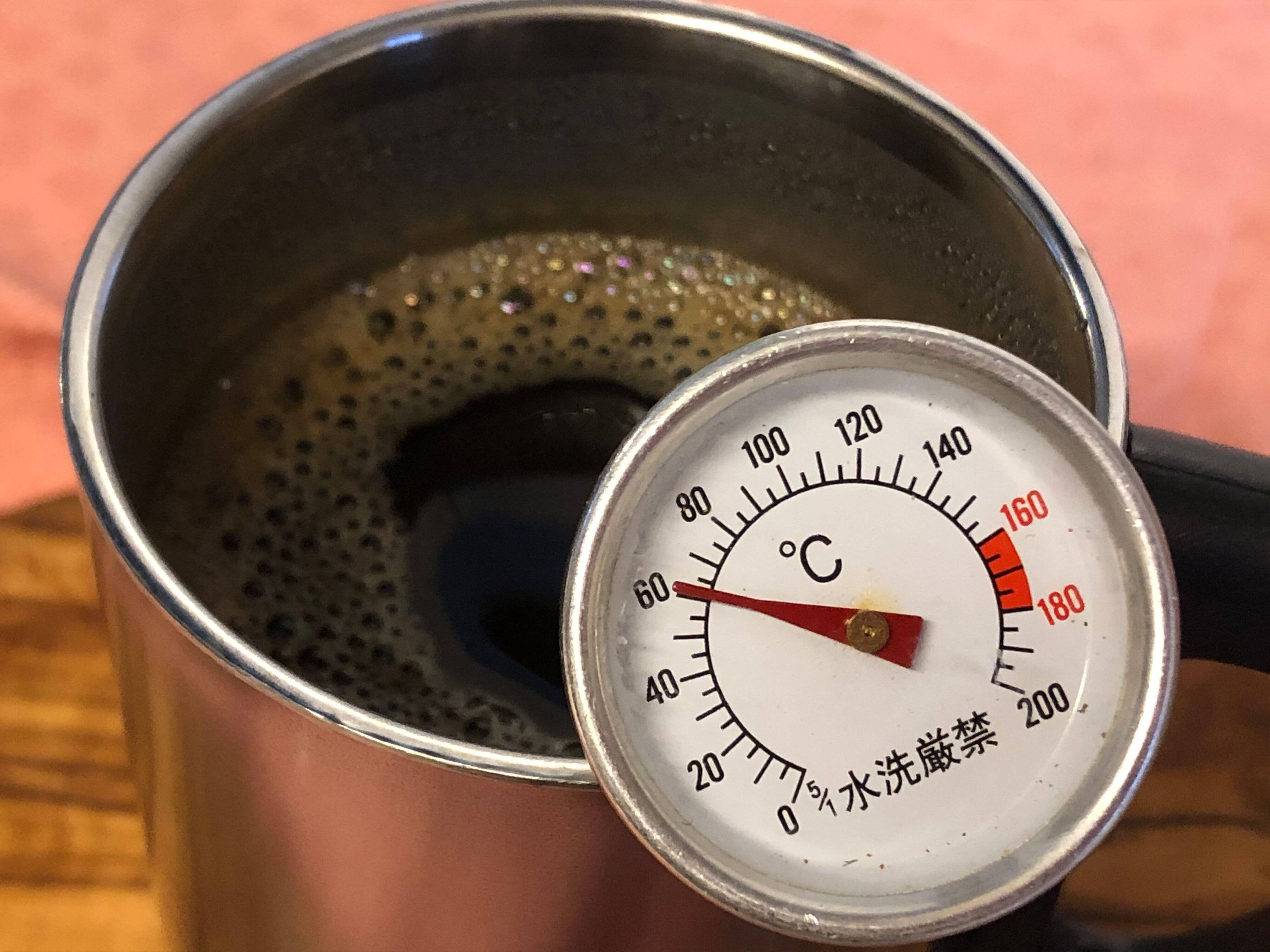 2.ドリップ直後、15分後、30分後、1時間後にふたを開けて、それぞれの時間のコーヒーの温度を測る。