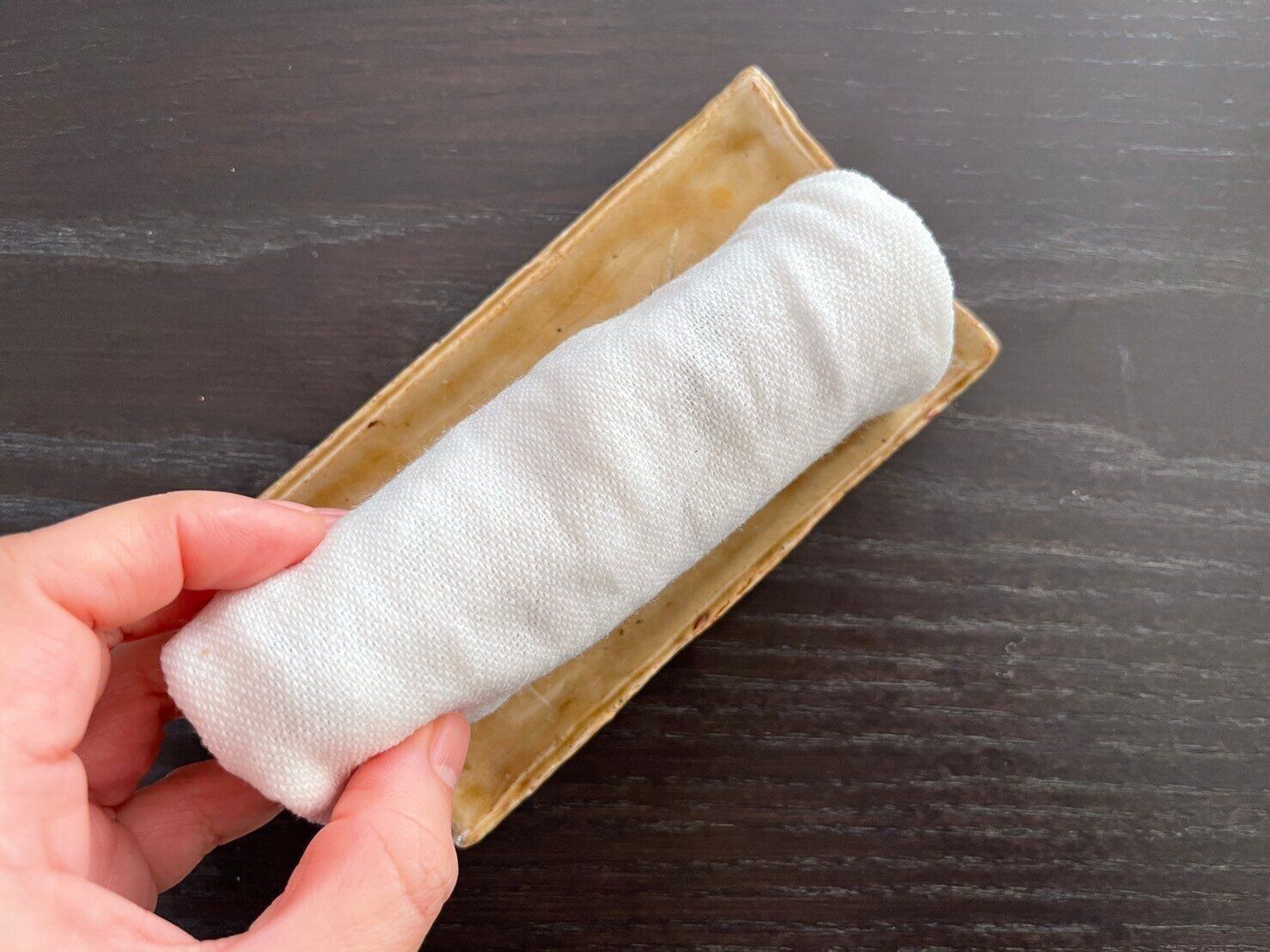 そのときに、この無印良品の布巾をぬらしてしぼったものをかけておくと、乾燥を防ぐことができます。