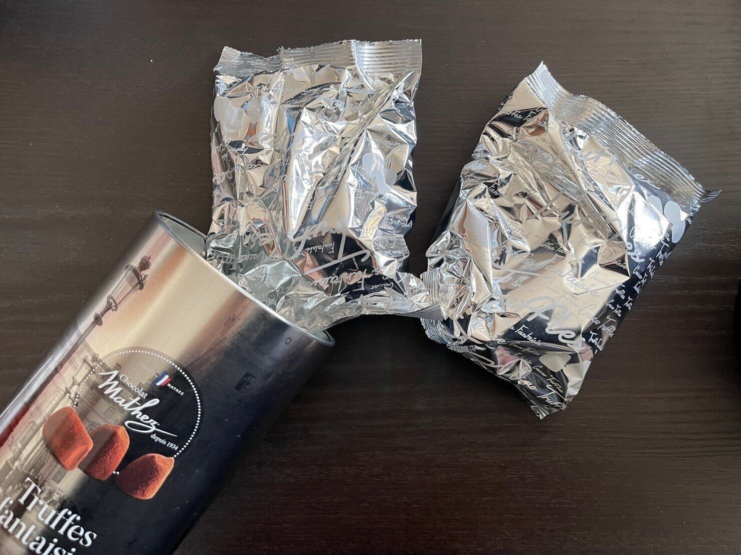 500gのトリュフチョコレートが入った缶が2缶セットで販売されていて、1つの缶の中には2つの袋が入っています。