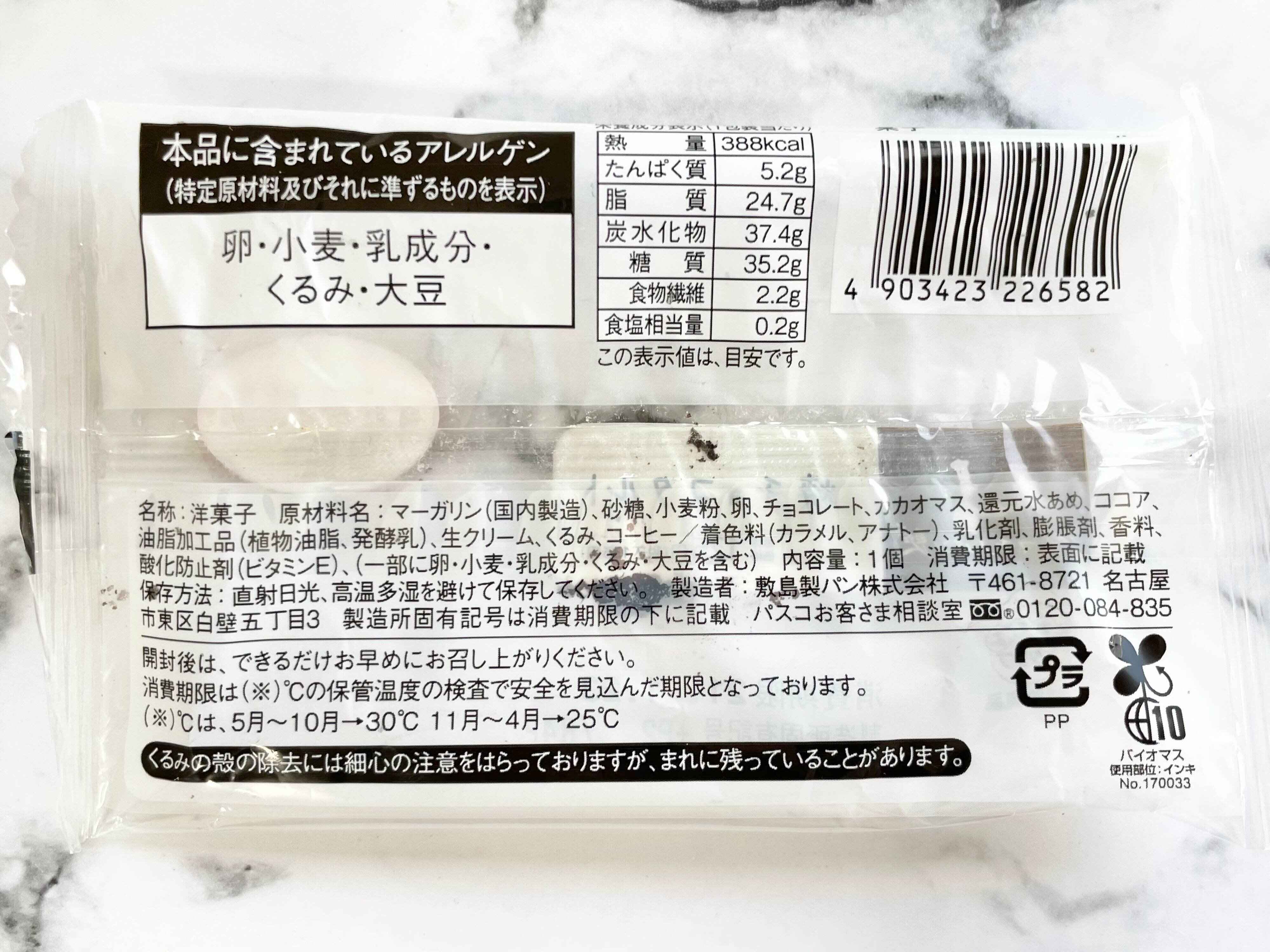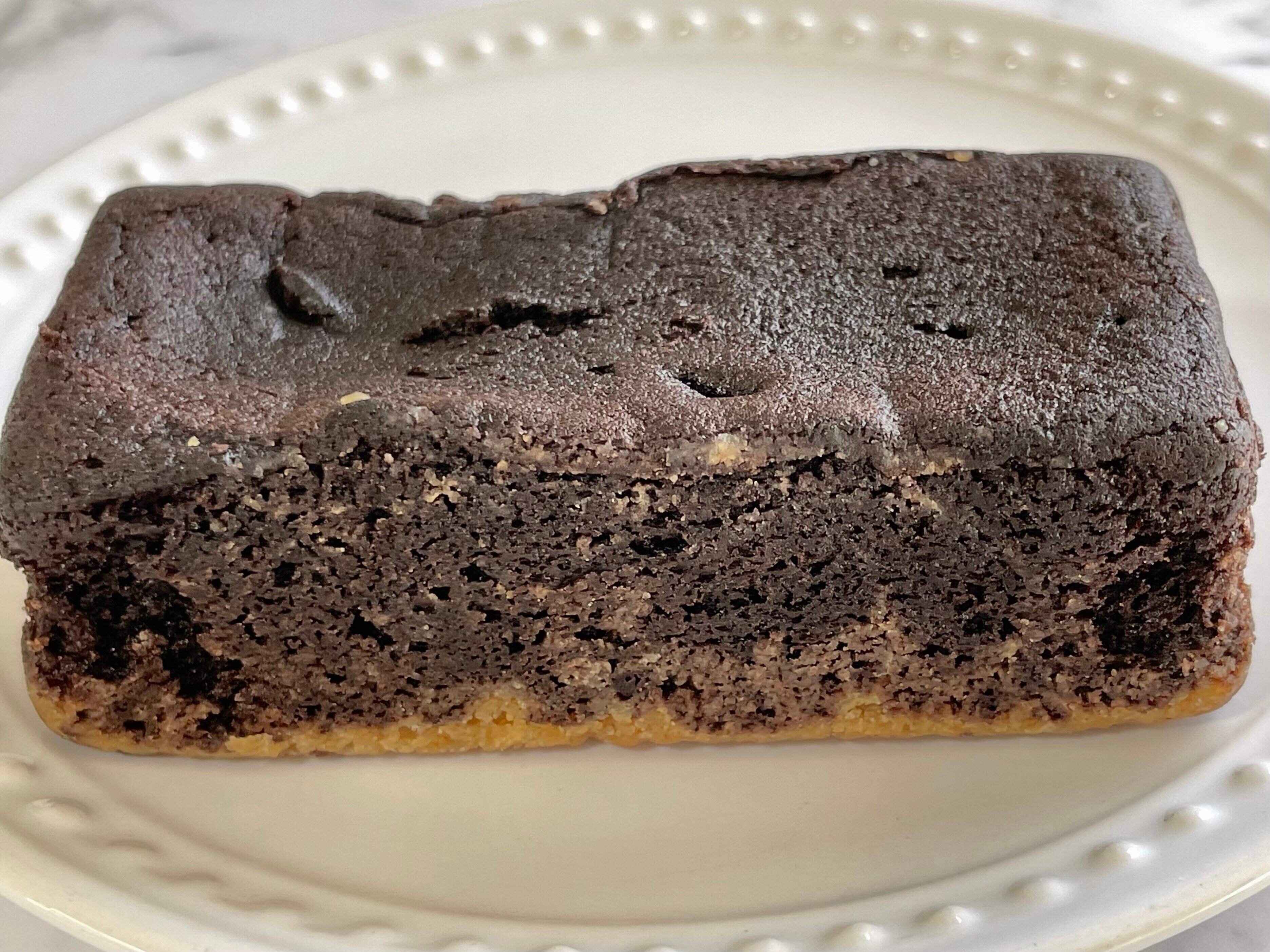 生クリーム、ココアを配合したしっとりとした食感のチョコ生地に、チョコタブレットと、隠し味にコーヒーを配合したくるみ入りタルト生地を合わせた商品。もはやパンではないけど、パン屋さんにありそうなので良しとします。