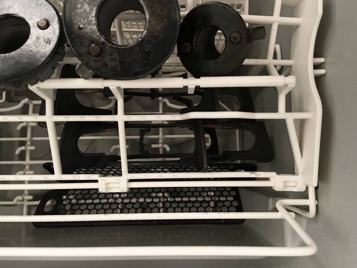 コンロ周りのパーツ(五徳、排気口カバー、シロッコファン、グリルの網と受け皿)は全て週一で食洗機の中に入れて洗ってしまいます。複雑な形状のパーツが多いので手洗いするよりも断然食洗機が楽ちん。週一で食洗機で洗っていれば、汚れが溜まることもなく特別な掃除用品も必要ありません。