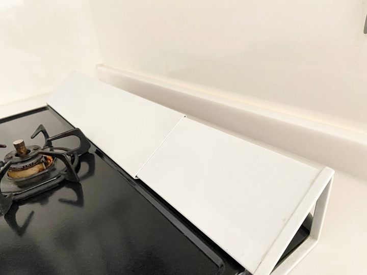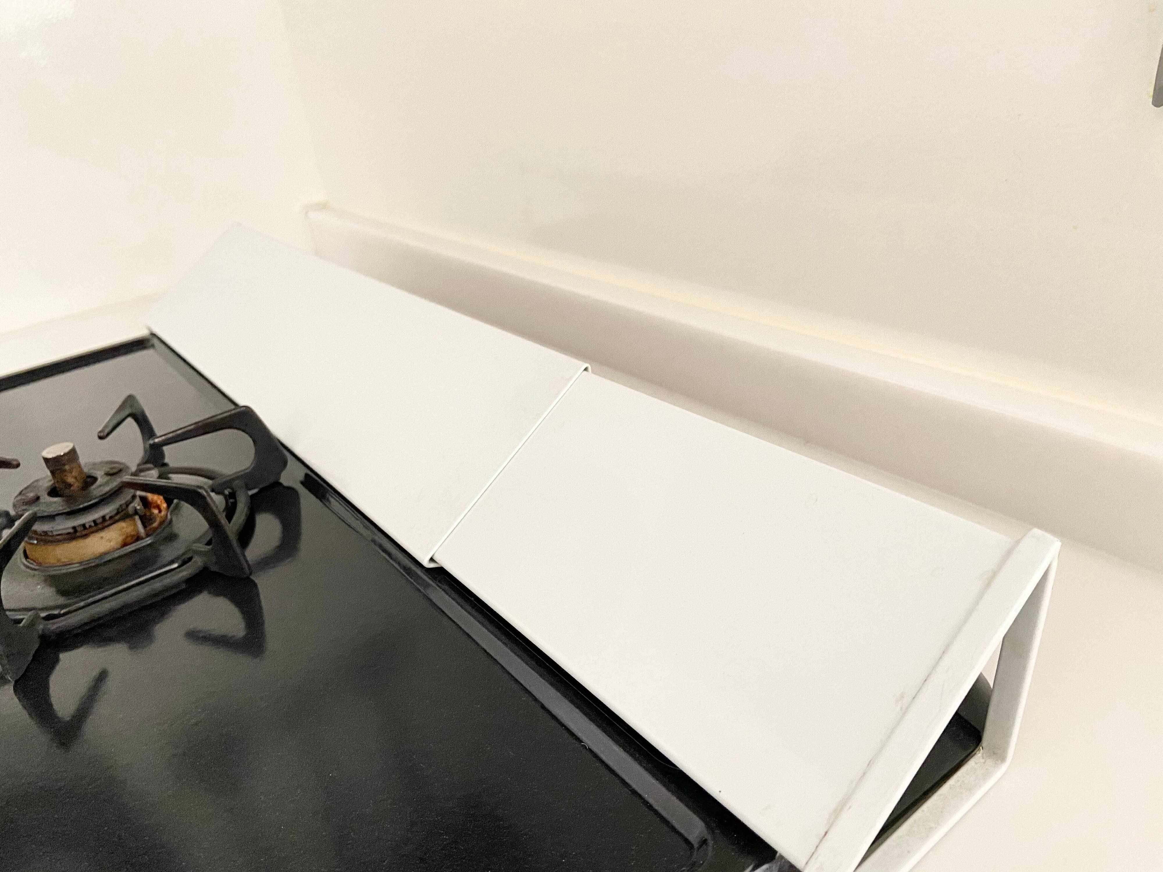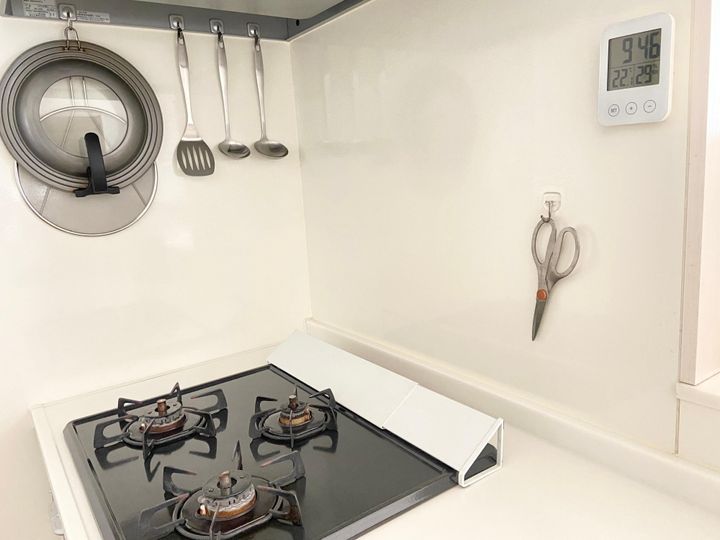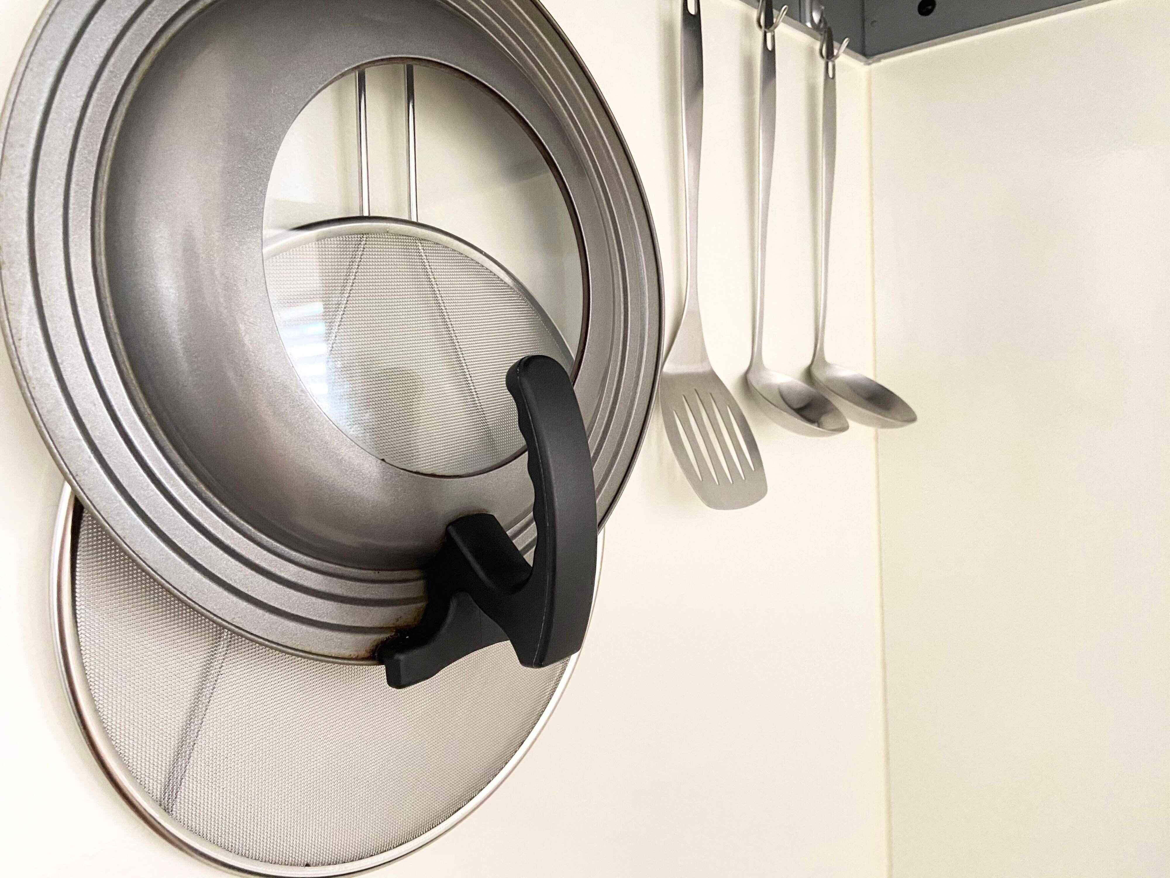 コンロ周りの汚れの一番の大敵は油ハネ汚れ!そのため、すぐに汚れを防止できるように、フタと油はね防止ネットはコンロ近くに吊るし収納にしています。