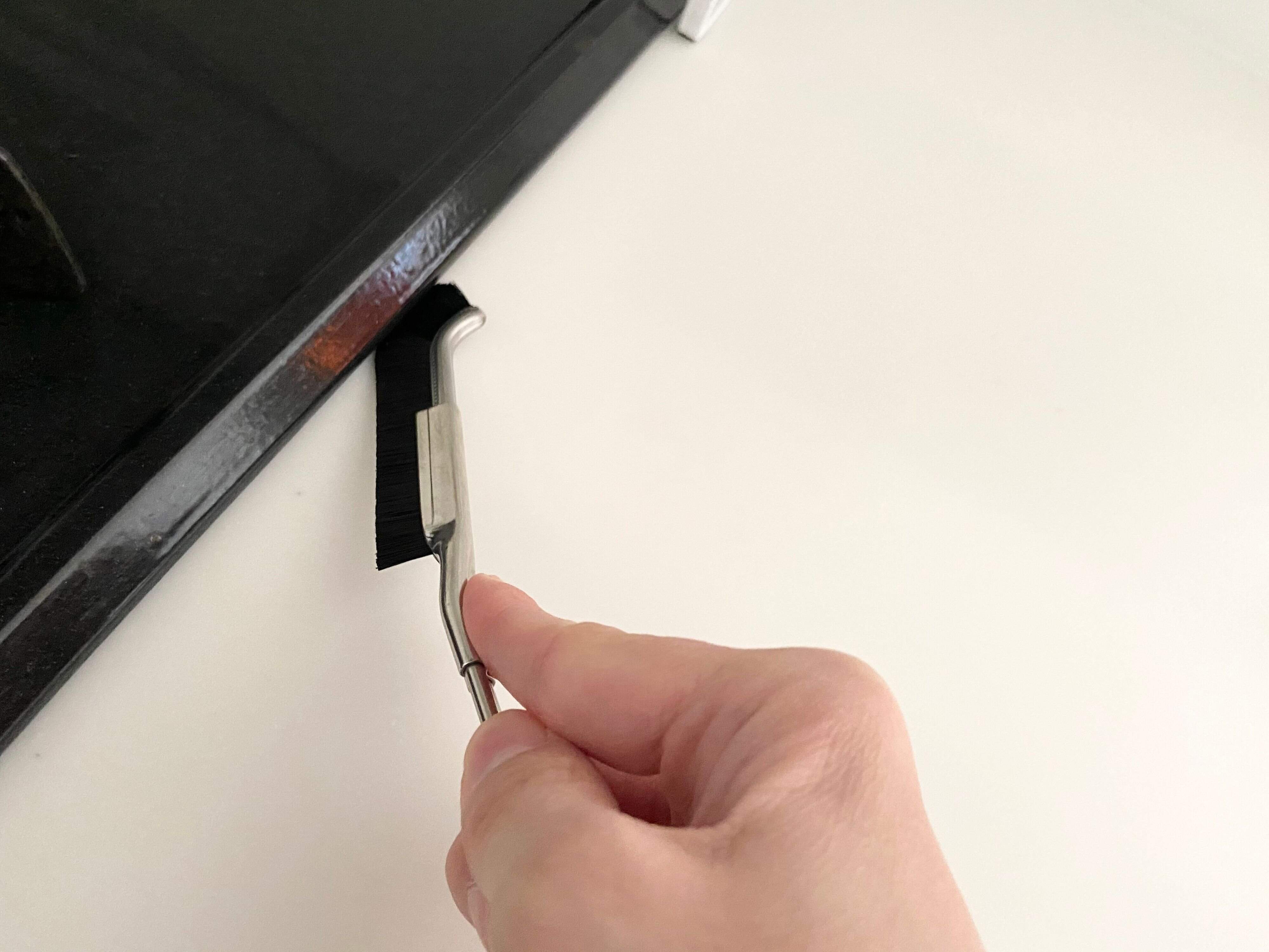 コンロ周りの隙間掃除には専用ブラシがオススメ。以前隙間ガードや汚れ防止テープを使って予防掃除をしていたことがあるのですが、ガード下に液だれが付着して余計に汚れが取りにくかったり、テープの貼り替えが面倒で怠ったりと自分には向いていなかったので今は止めてしまいました。普通に拭きあげても取れない汚れは、気になるときに専用掃除ブラシでサクッと汚れをかき出してしまうことにしています。