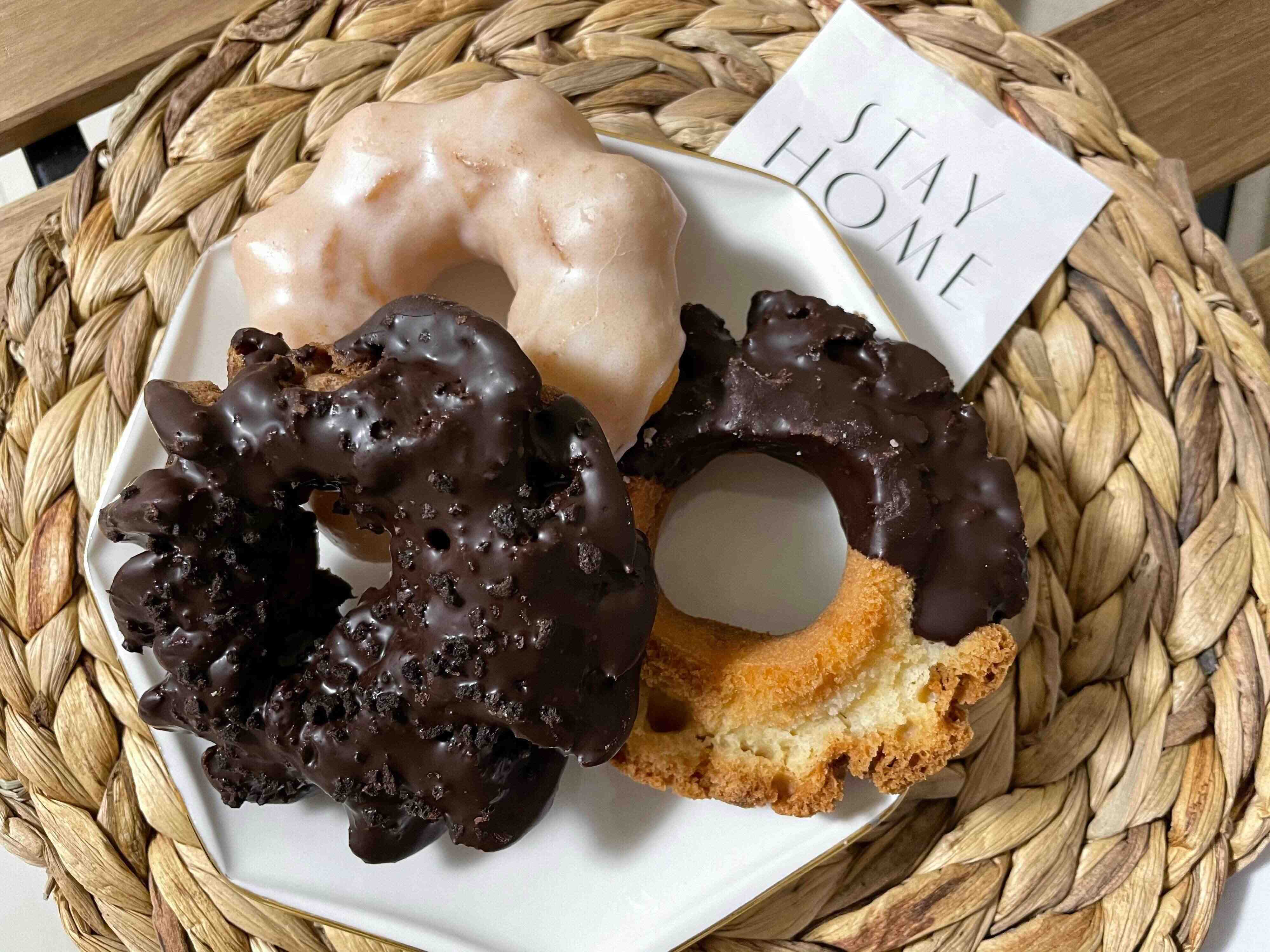 チョコレートがかかったオールドファッション、サクサク食感のクルーラー、もちもちリングシュガーが4個セットに。