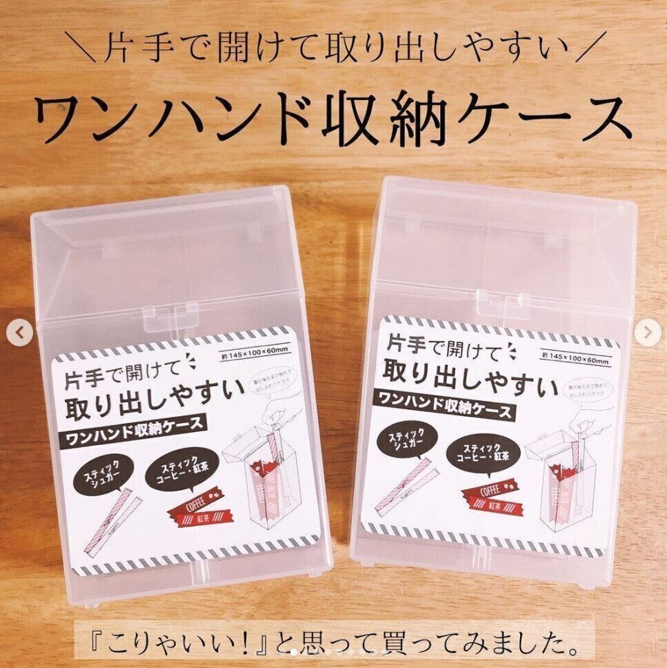 スティック状の砂糖やコーヒーがしまえて、片手で取り出せるケースです。仕切り板がついているため、ストックが少なくなってきても取り出しやすいです。