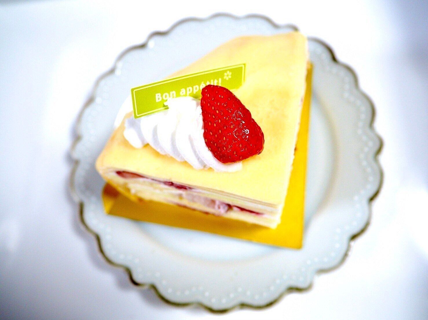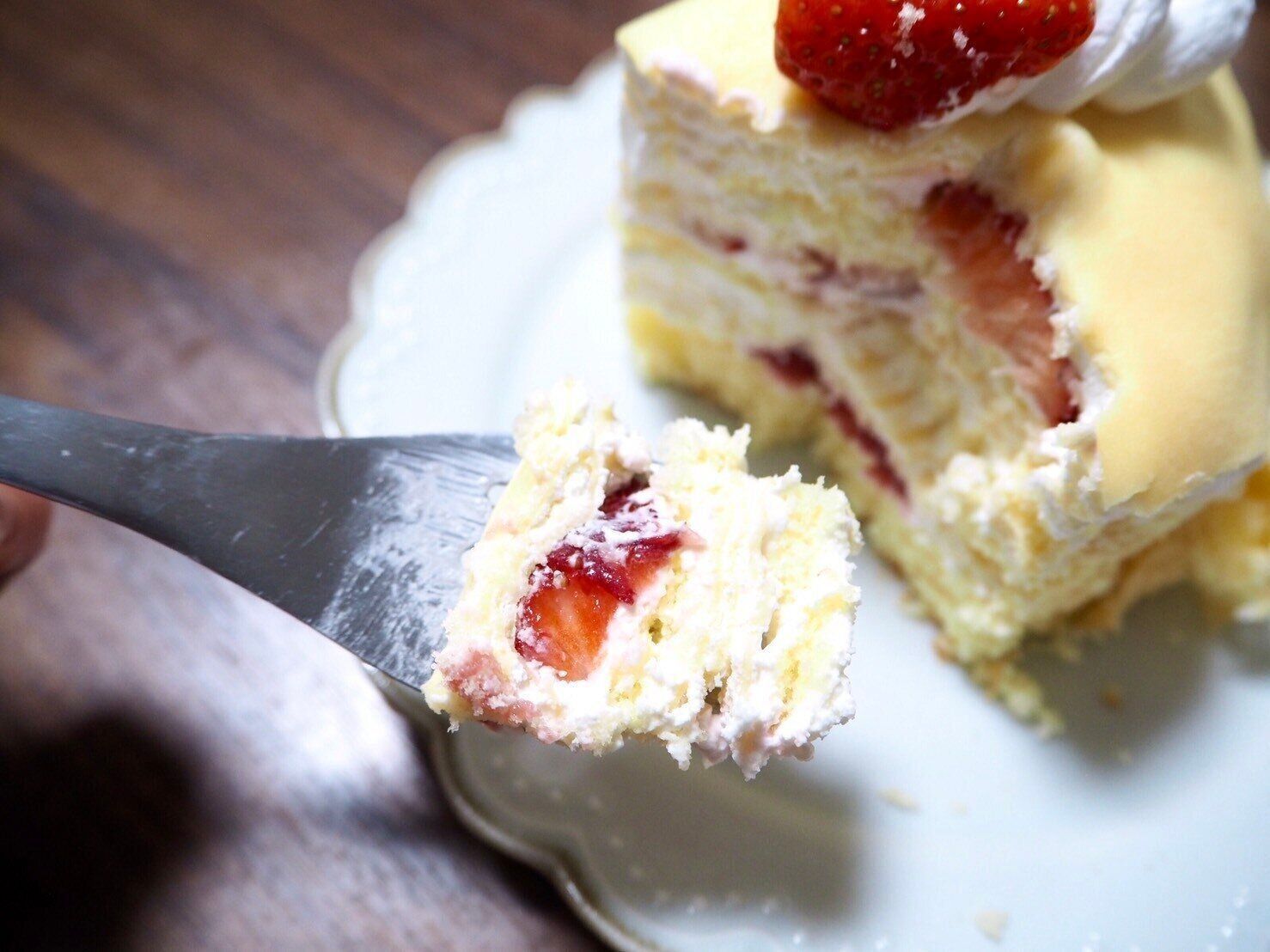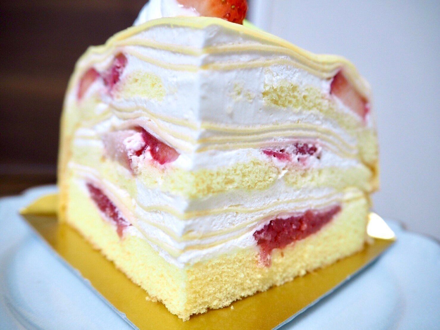 スポンジ生地、苺、クレープ生地、クリームが何層にも積み重なって、かなりの重量があります。