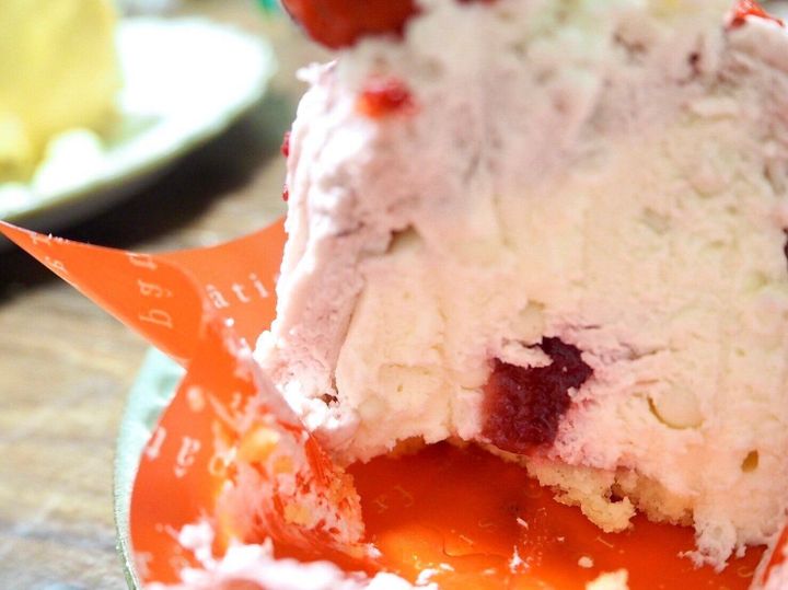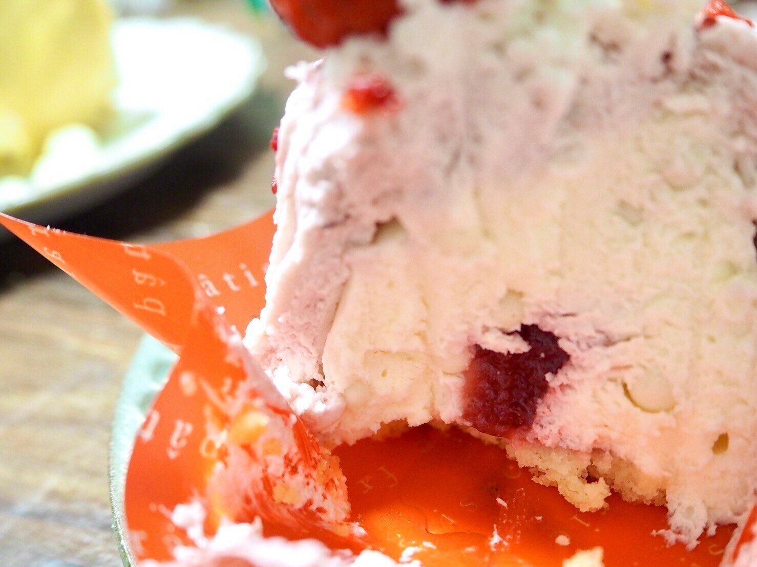 優しい苺の甘さのクリームがおいしい~!中からは白いクリームが登場しましたが、こちらは練乳入りホワイトチョコムース。甘みが強く、結構ずっしりめです。この2つのクリームの組み合わせがバランスが良い。